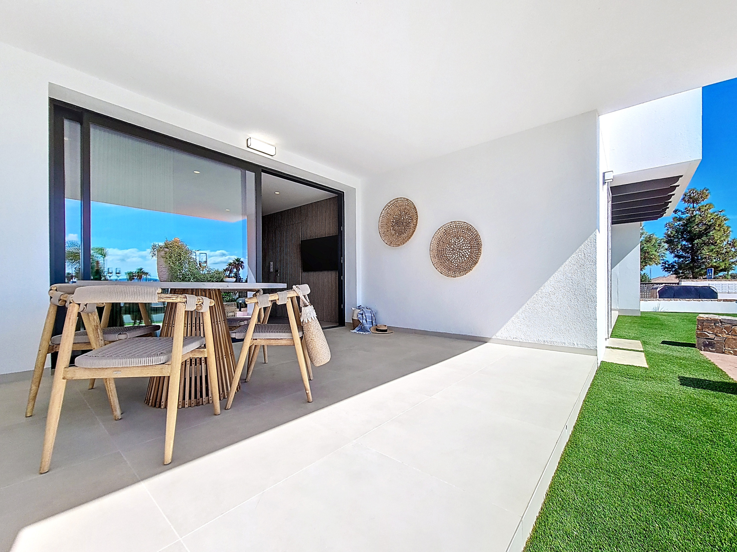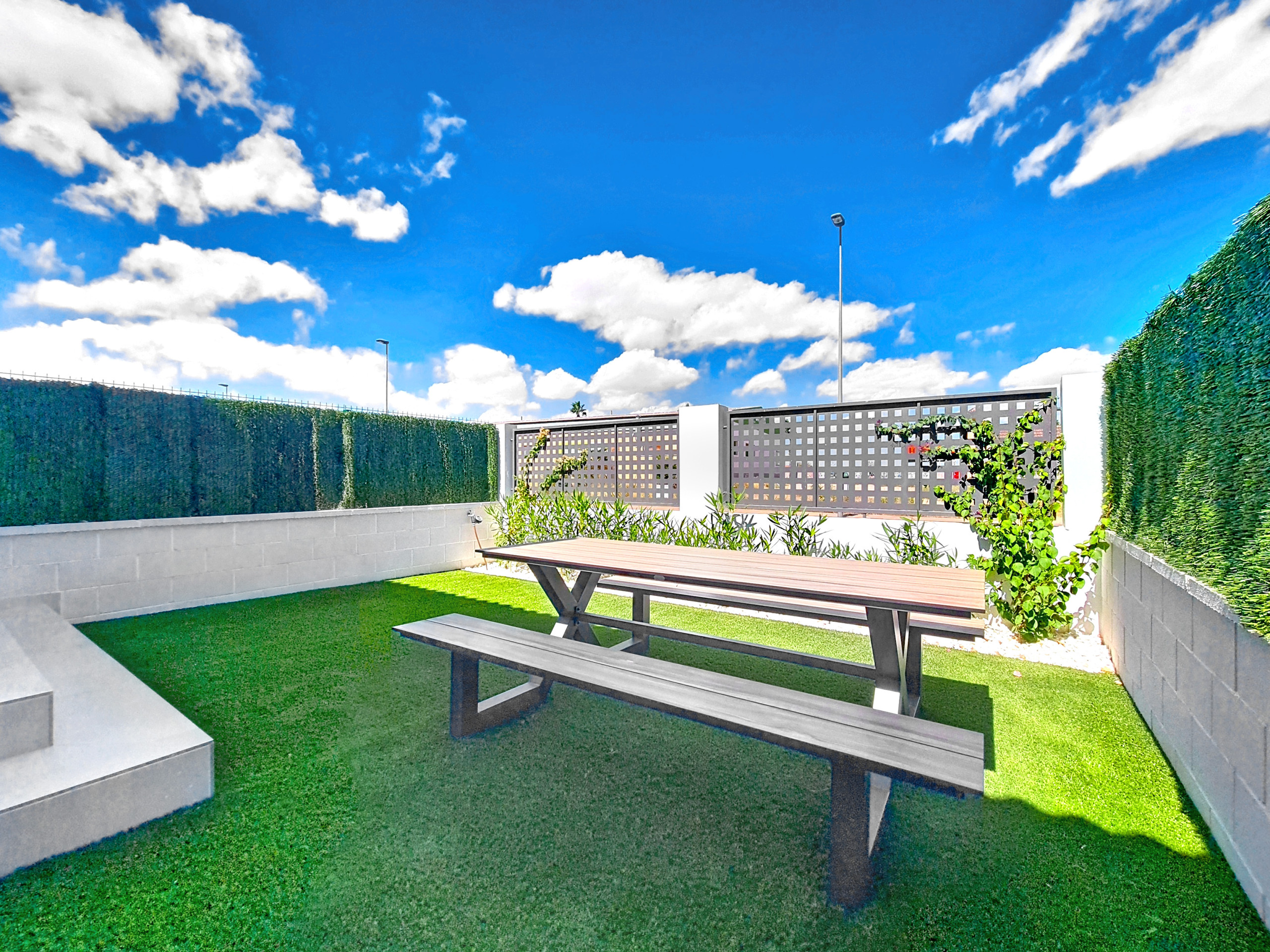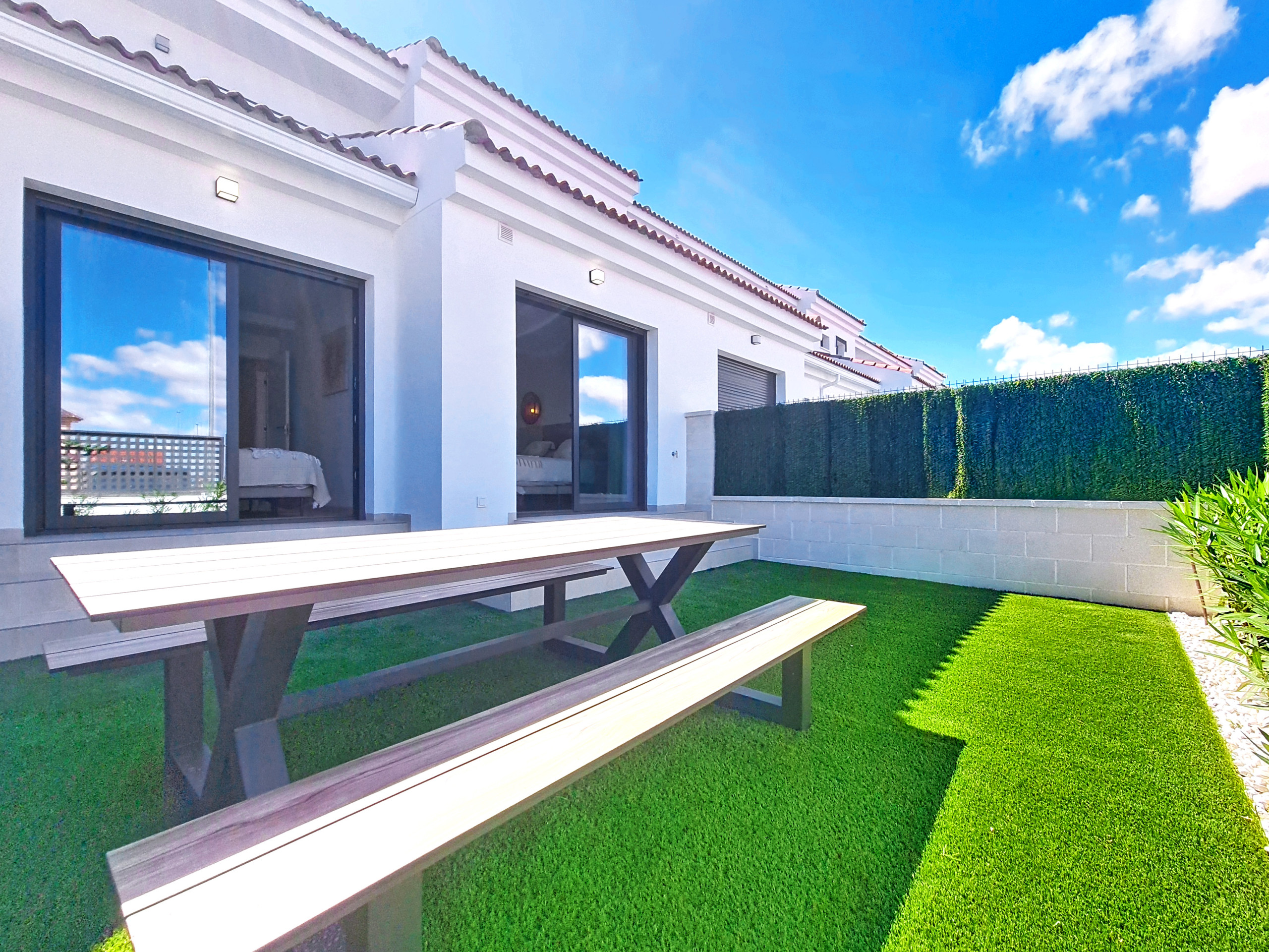The front patio is furnished with a table and chairs, perfect for enjoying meals outdoors while taking in the pool and garden views. The rear private garden features a large, stylish table with bench seating, offering a tranquil space for outdoor dining or relaxing in privacy. This is accessible by both bedrooms.