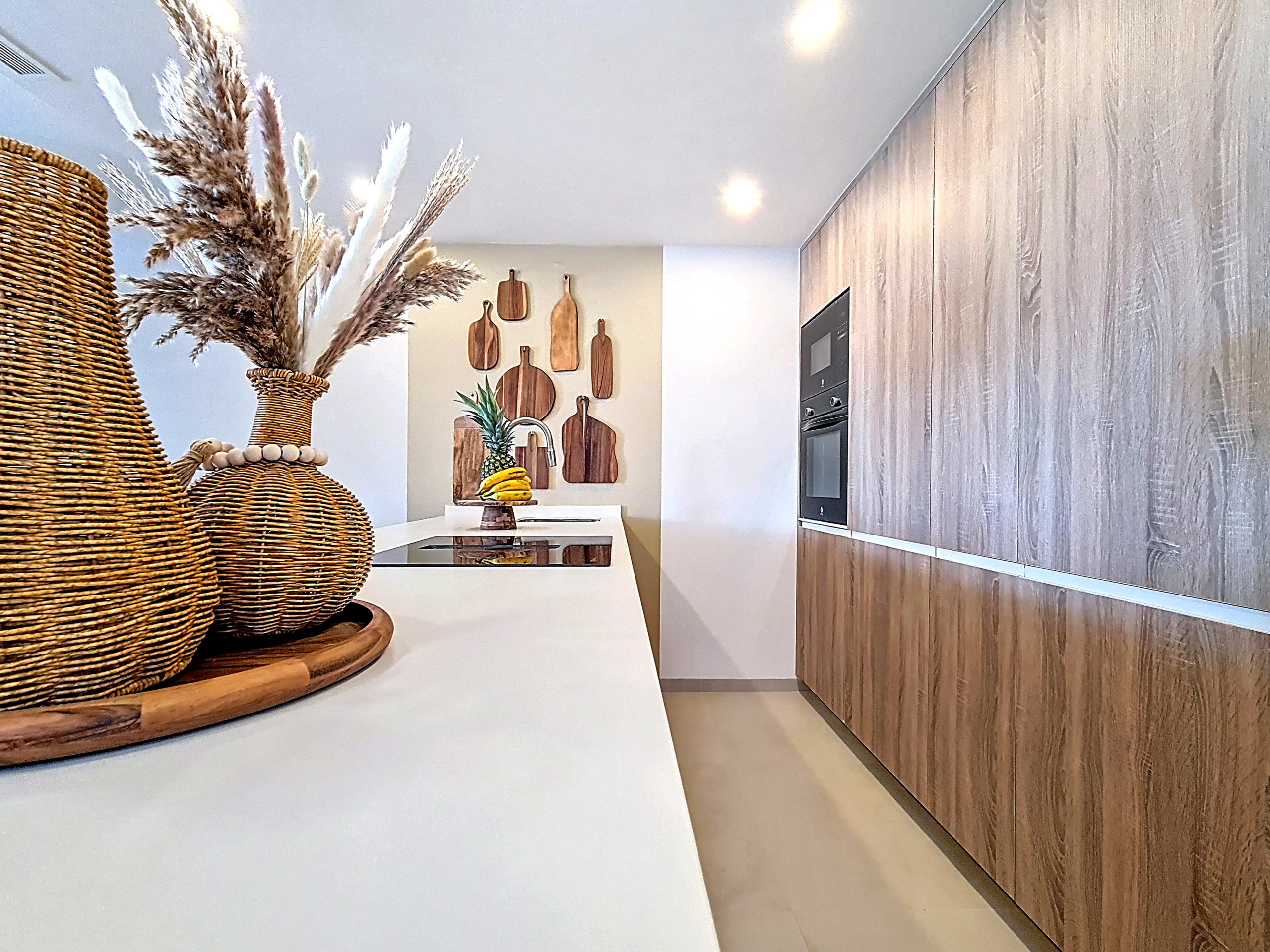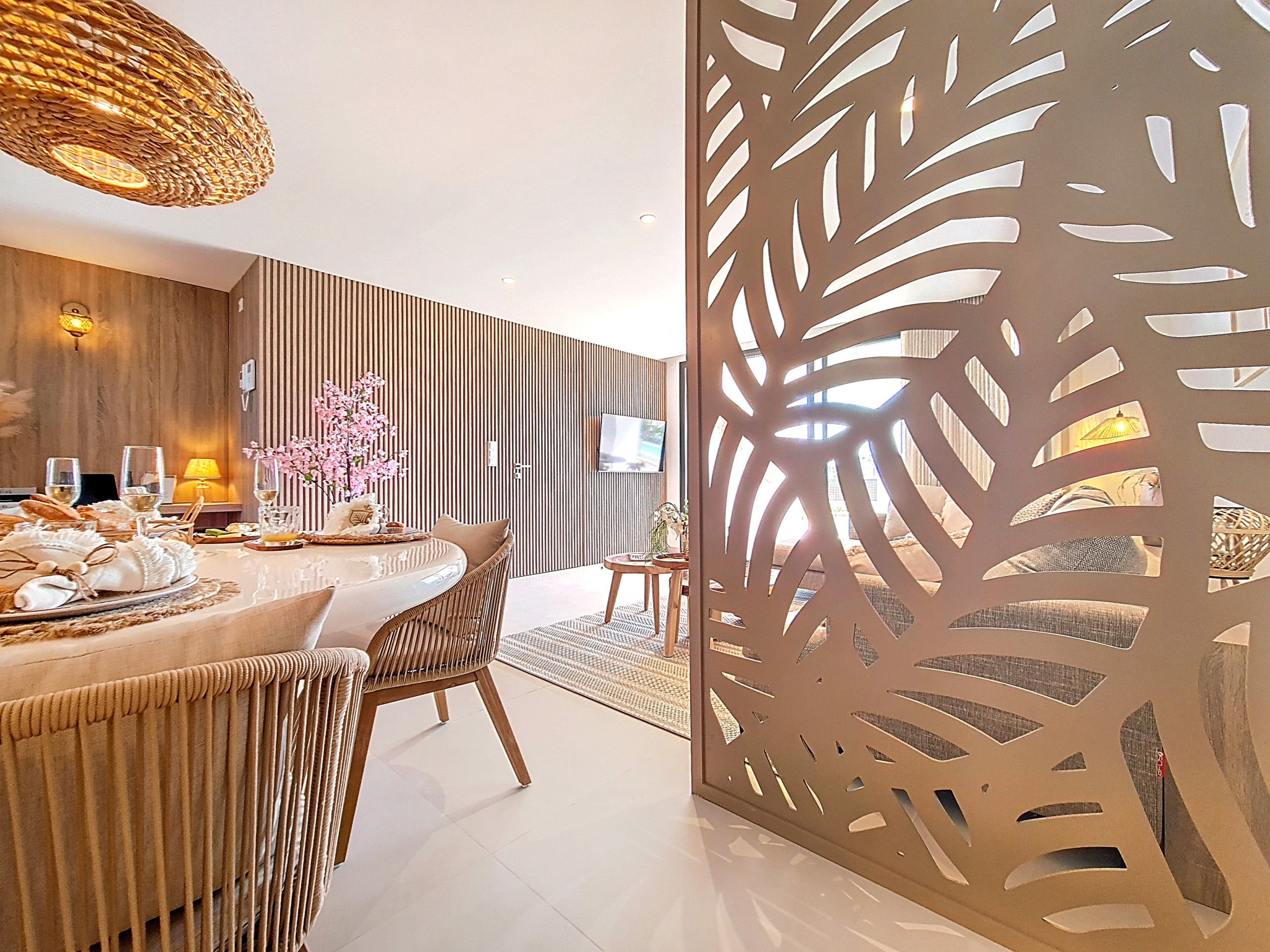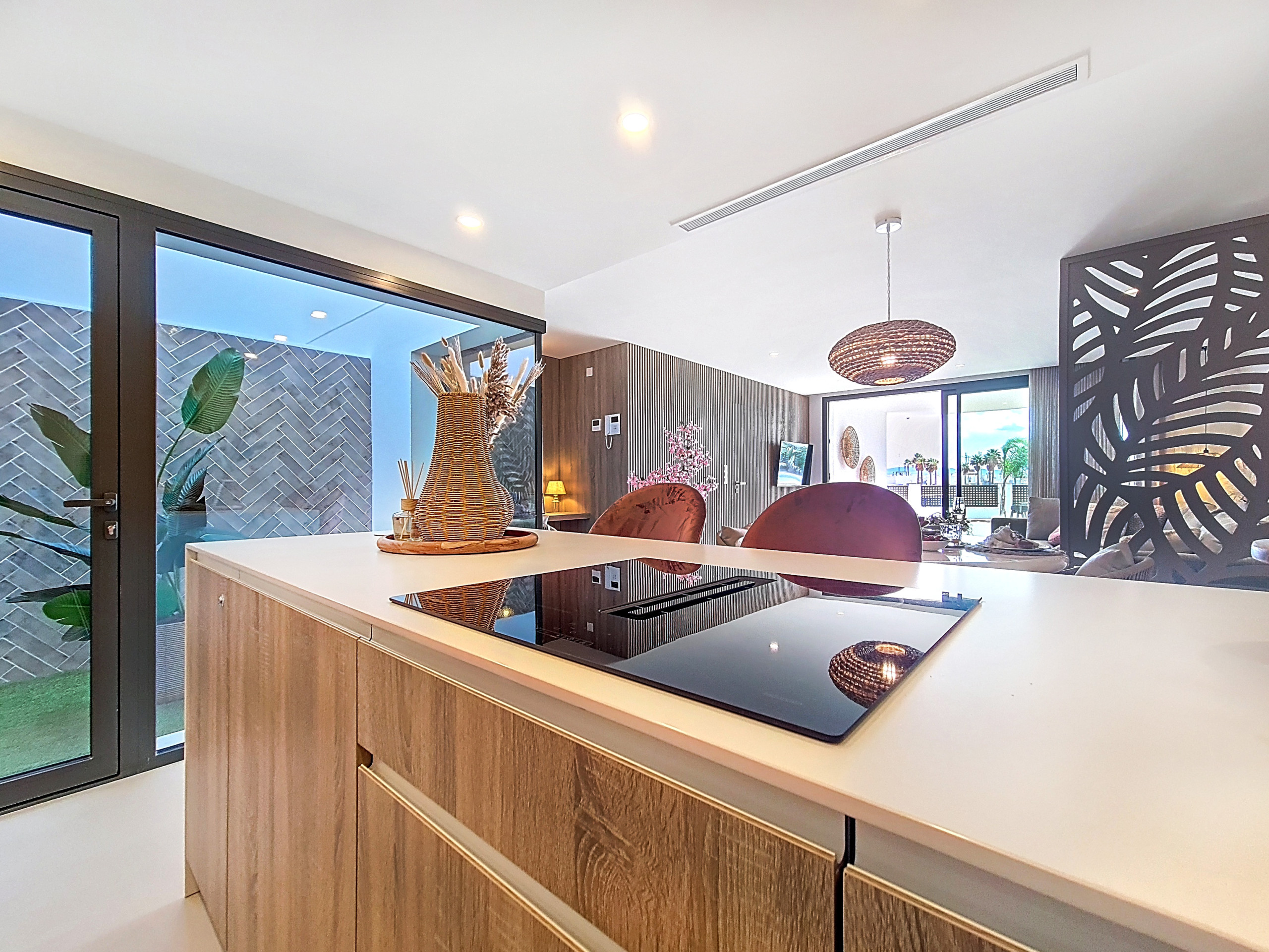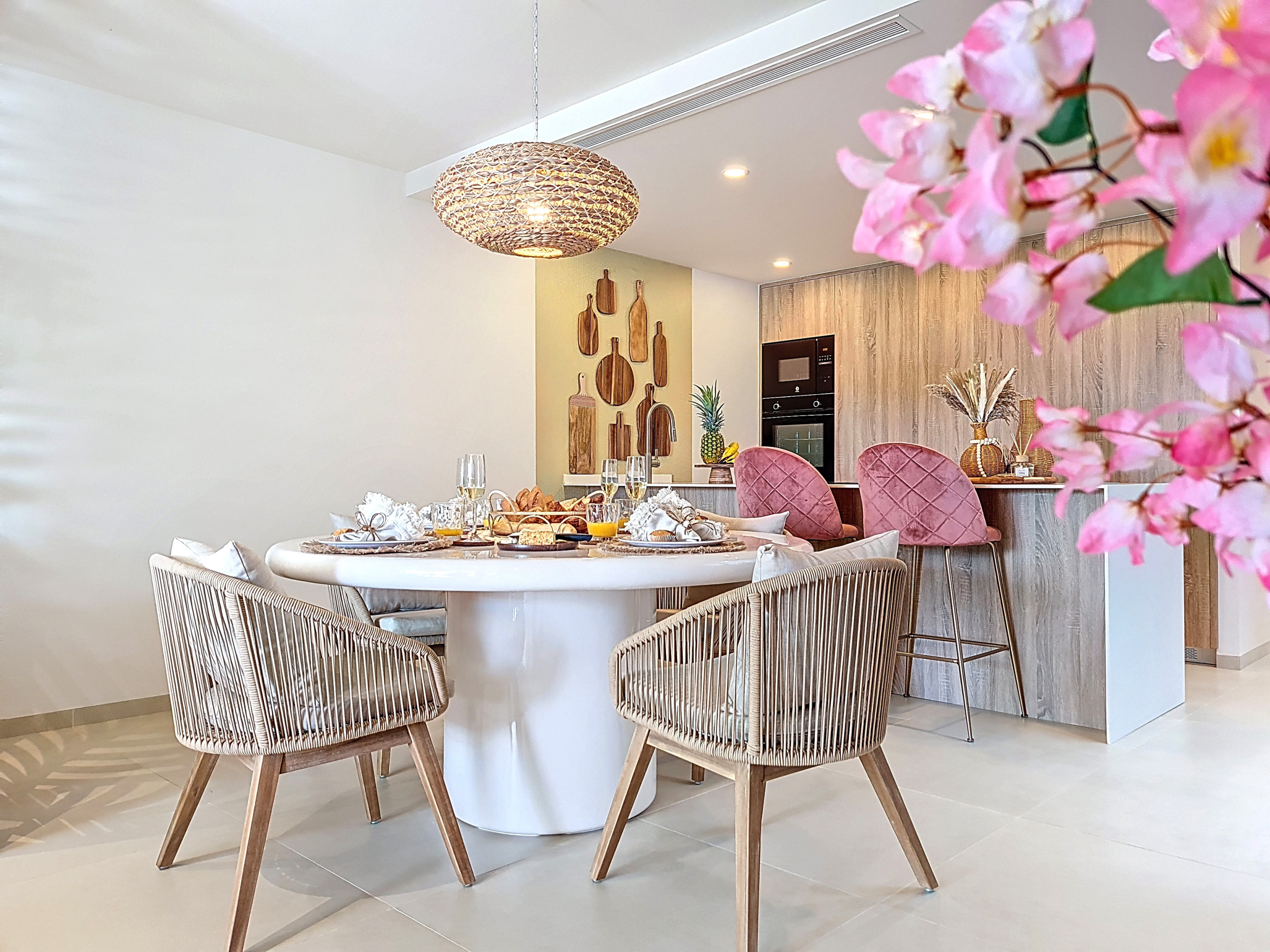 Inside, the apartment has been decorated to a very high standard, featuring warm wood tones, soft grey, dusky pink, and a hint of gold, reflecting careful attention to detail. The open-plan kitchen, dining area, and lounge are complemented by a built-in work desk with a wooden worktop, creating a cosy work-from-home area within the living space.