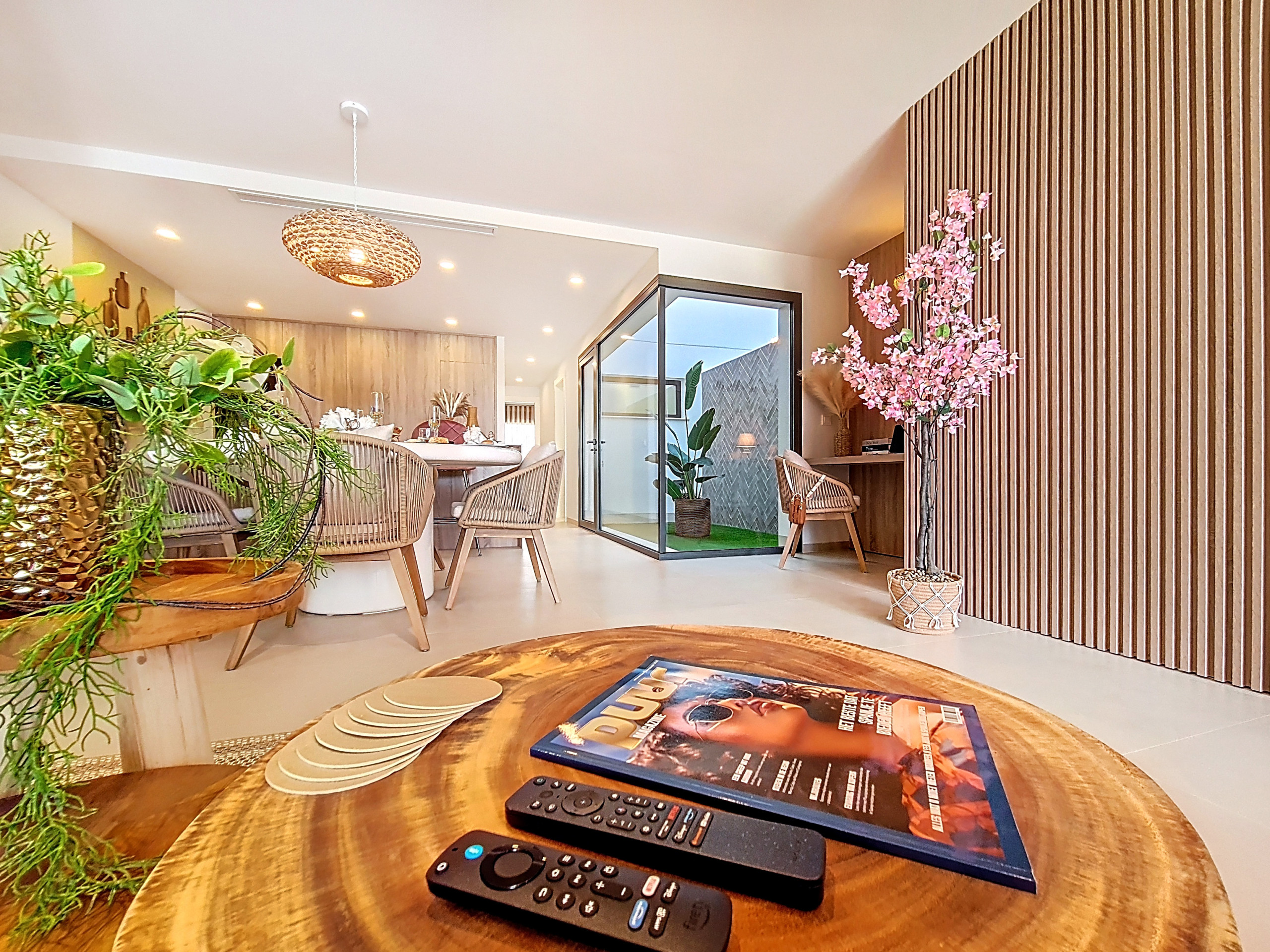 The front patio is furnished with a table and chairs, ideal for outdoor dining while enjoying pool and garden views. The rear private garden features a large stylish table with bench seating, offering an additional space for meals or relaxing in privacy. This area is accessible from both bedrooms.