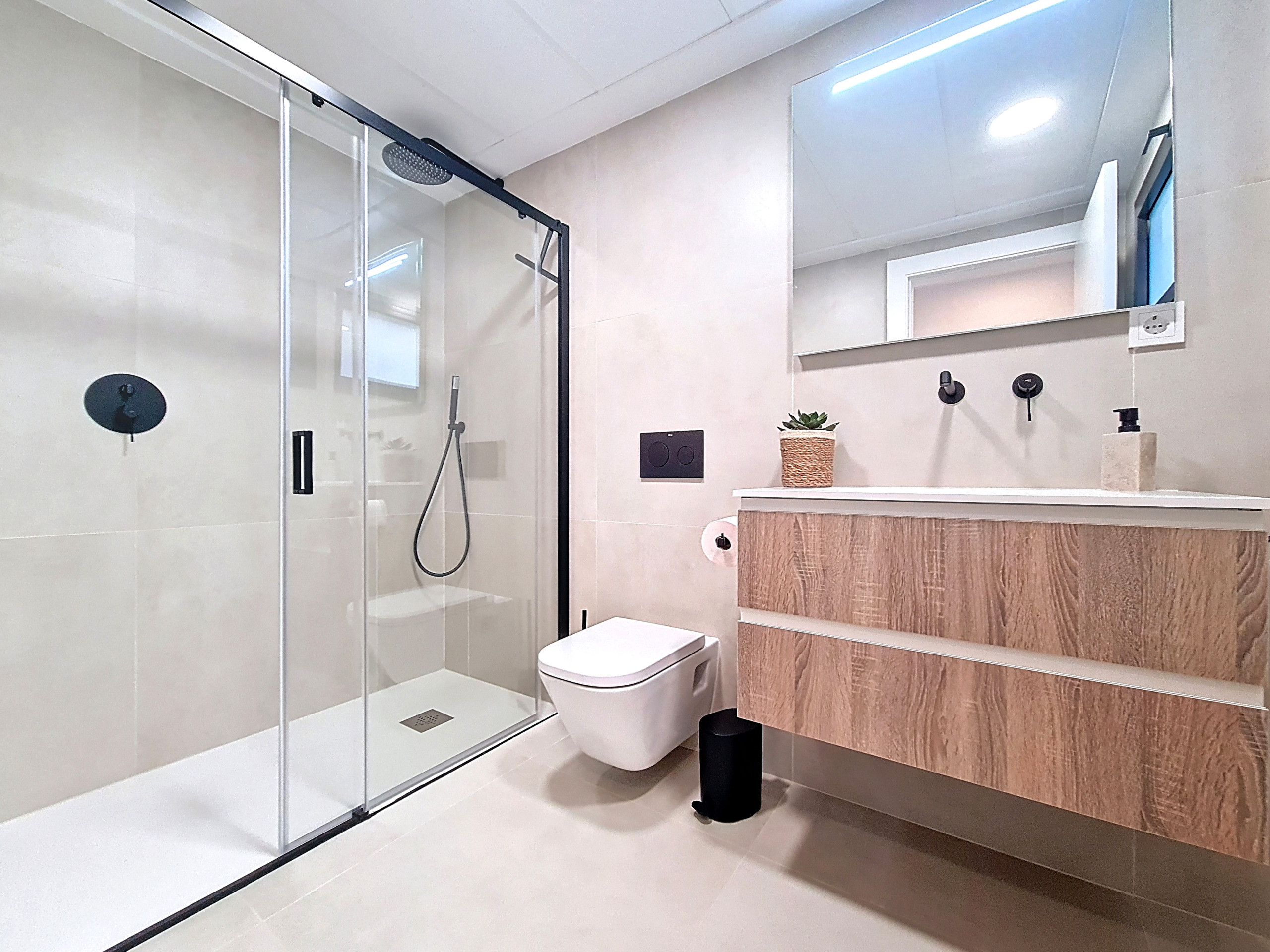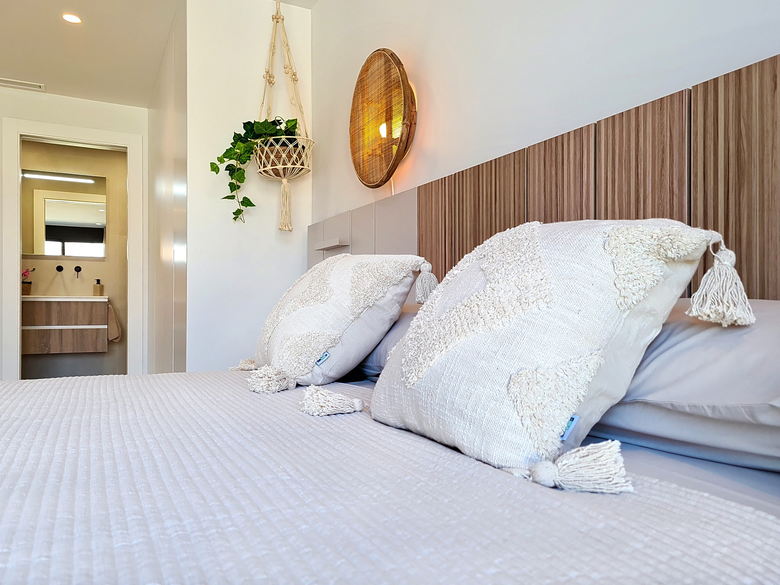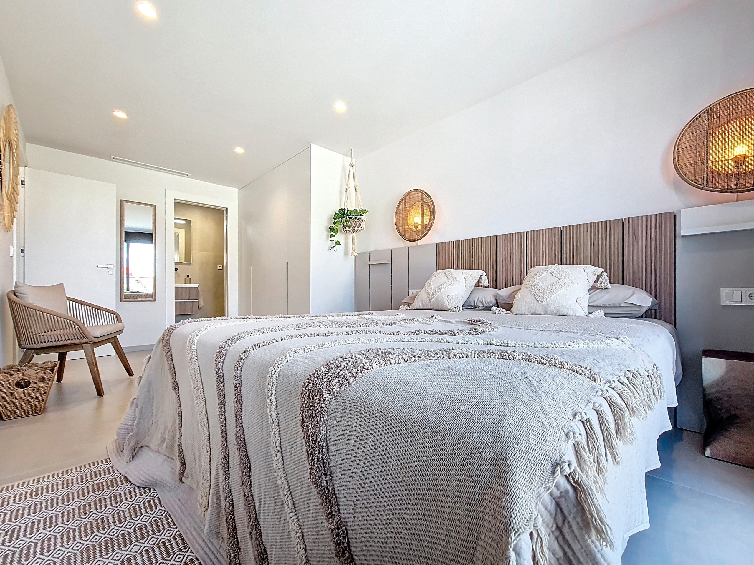 Both bedrooms are elegantly styled with warm wood and natural tones, complemented by carefully chosen lighting that creates a welcoming and sophisticated ambiance. The master includes a private en-suite bathroom, while the second bedroom is served by a modern bathroom with a sleek walk-in shower.