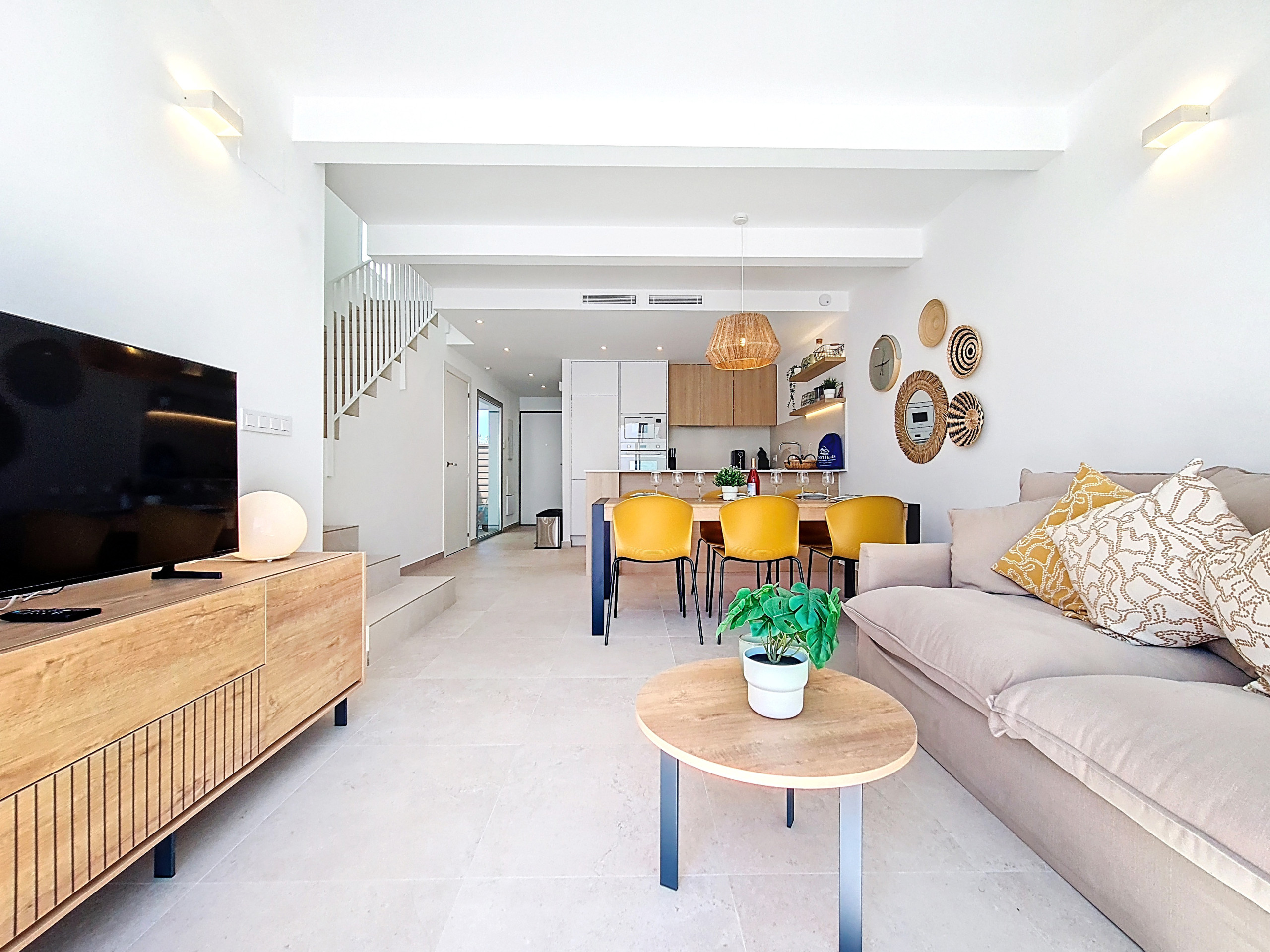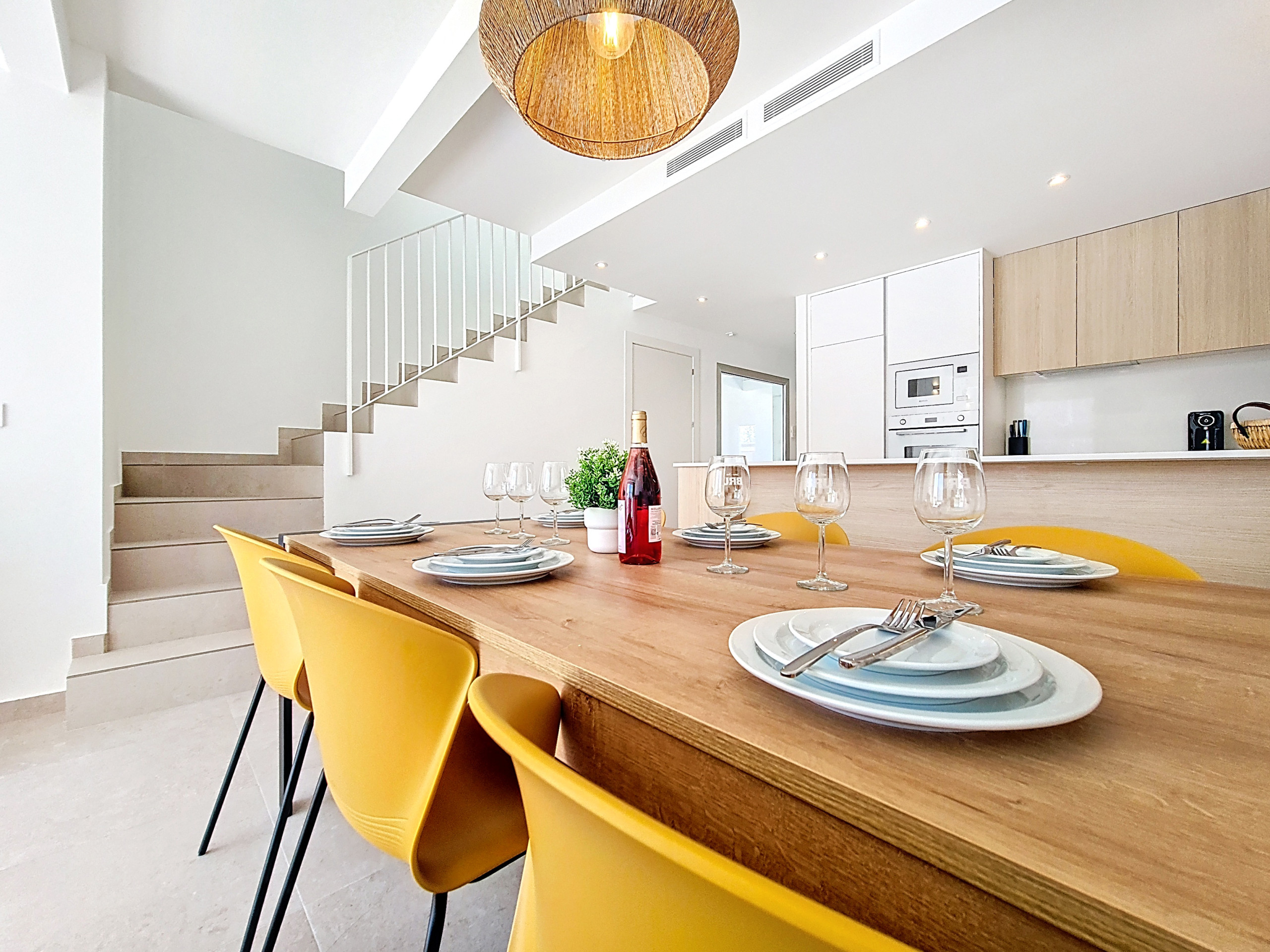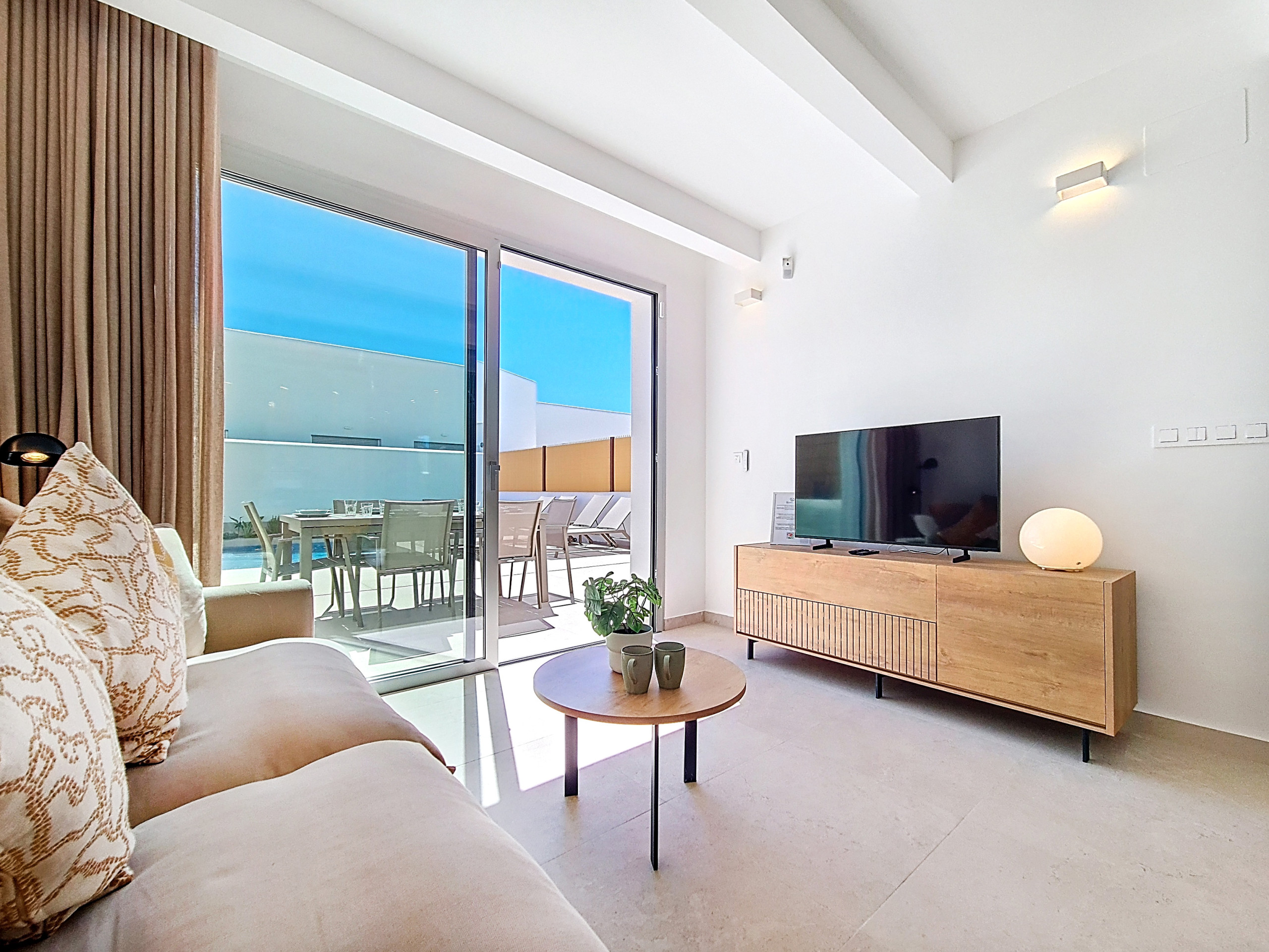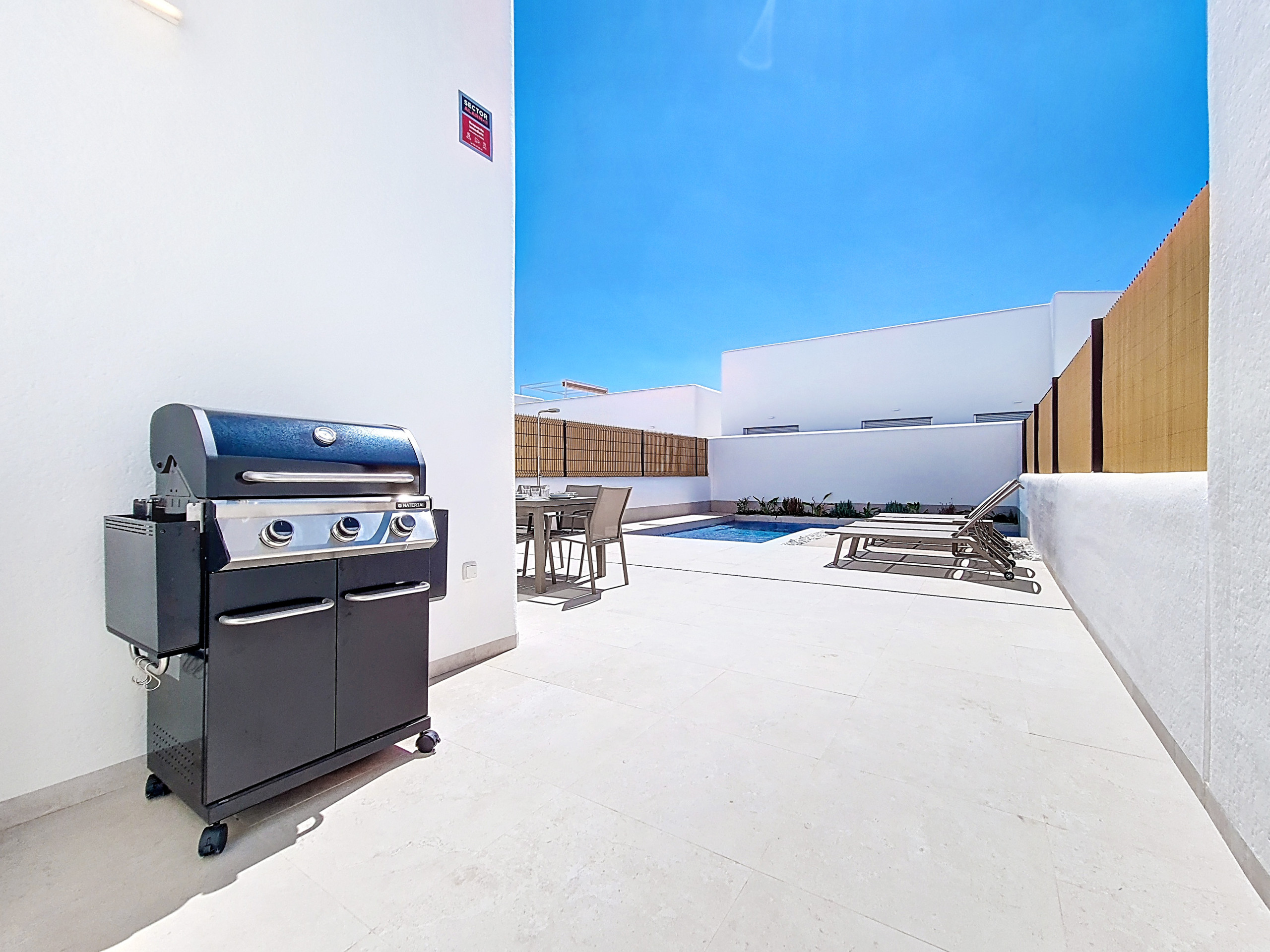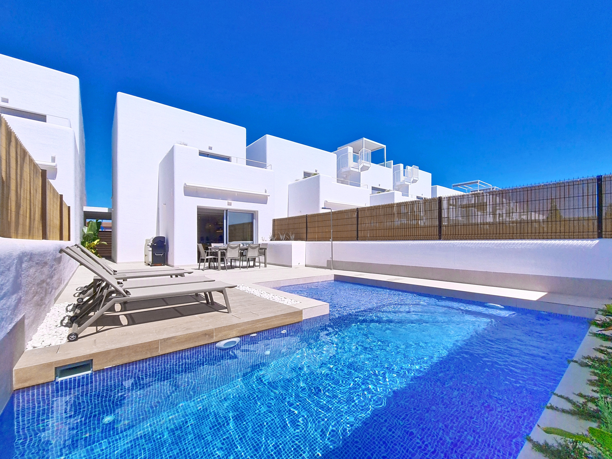 This stylish brand new 3 bedroom villa is located in a popular area of Los Alcazares and is walking distance to the beach, bars, restaurants and shops. The villa has its own private pool with a large sheltered outside dining space and BBQ area.