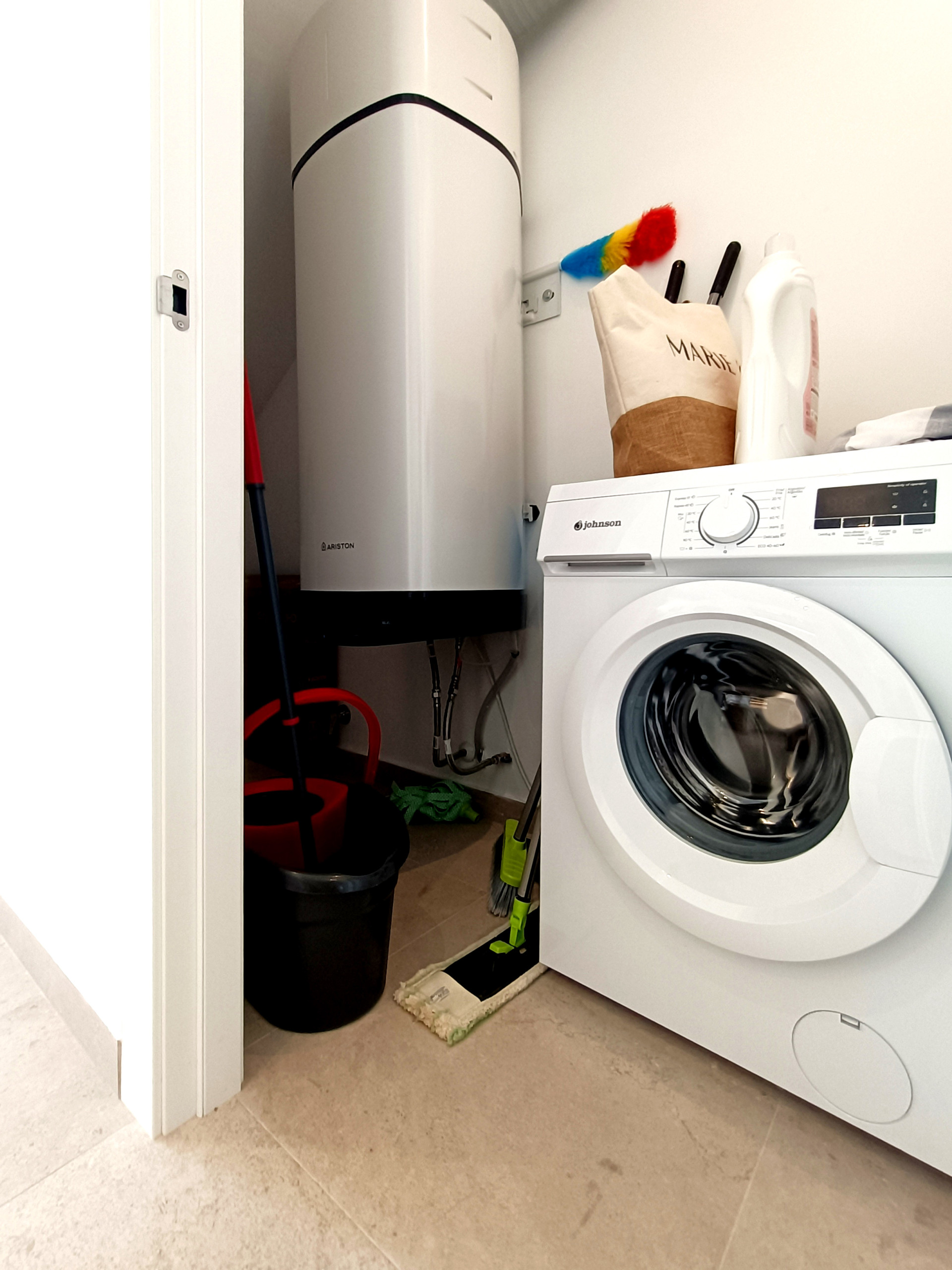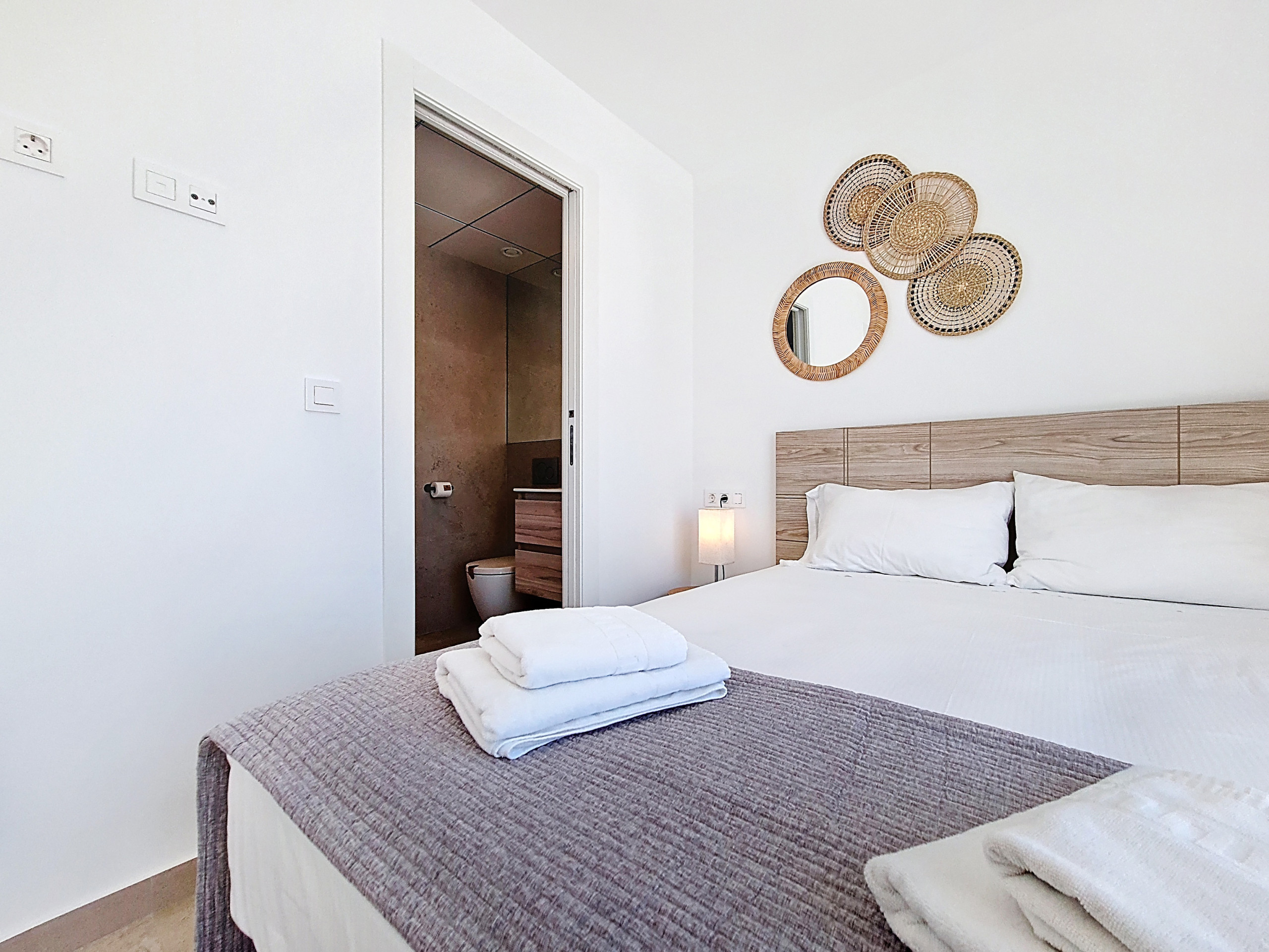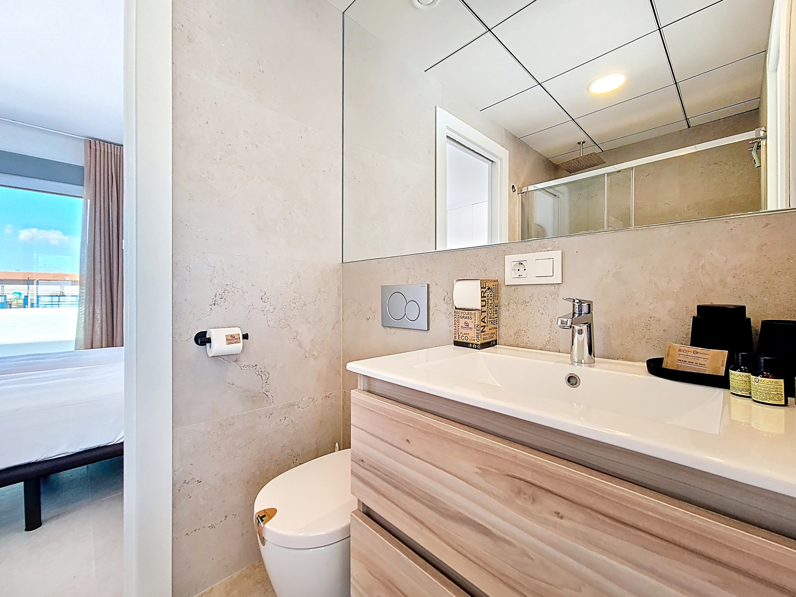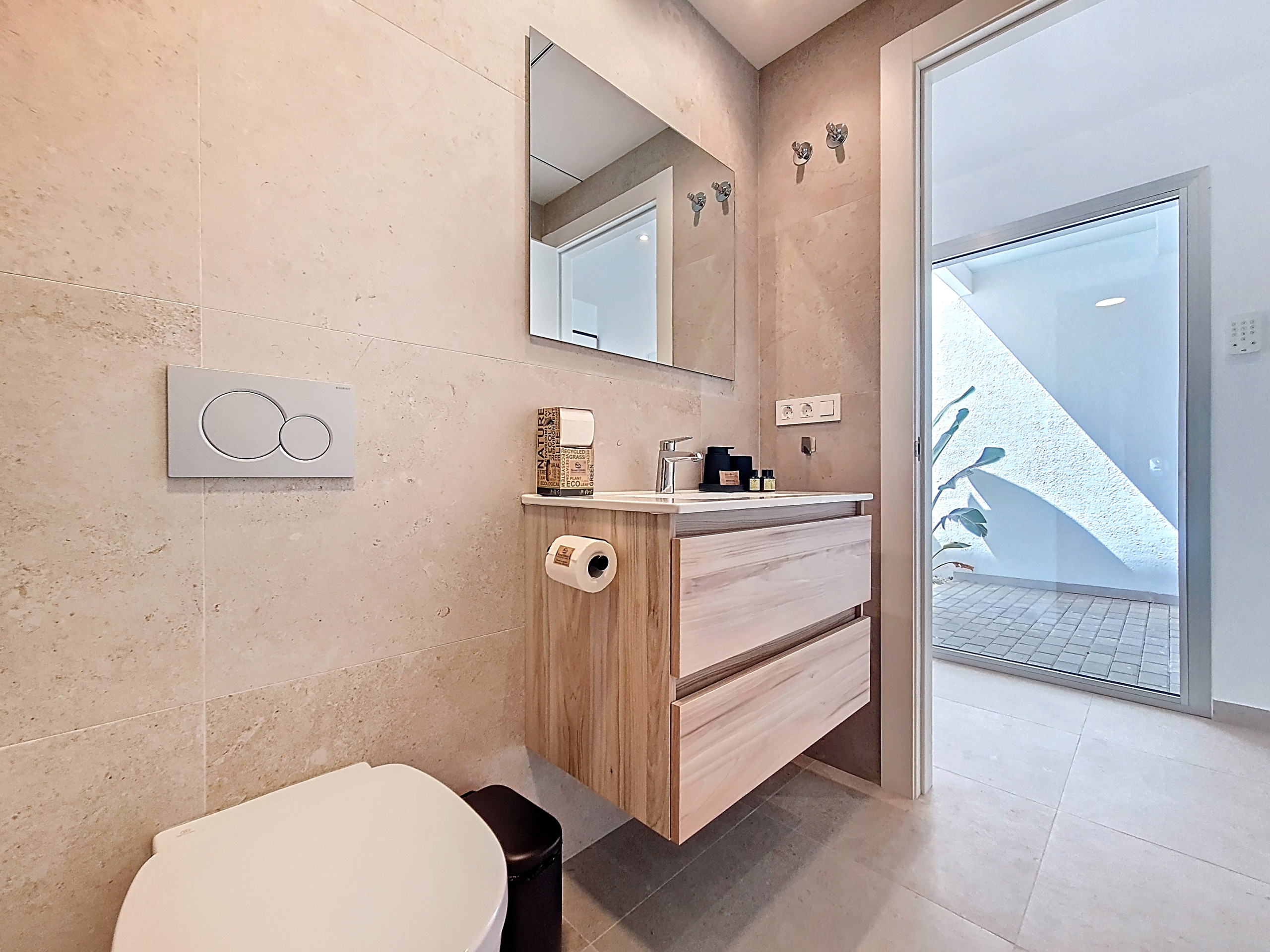 The villa’s 3 bedrooms are thoughtfully designed. On the ground floor, the bedroom has direct access to a bathroom, which also has a separate entrance from the hallway. This clever layout allows the bathroom to serve both as a private ensuite and as the main downstairs bathroom for the villa.