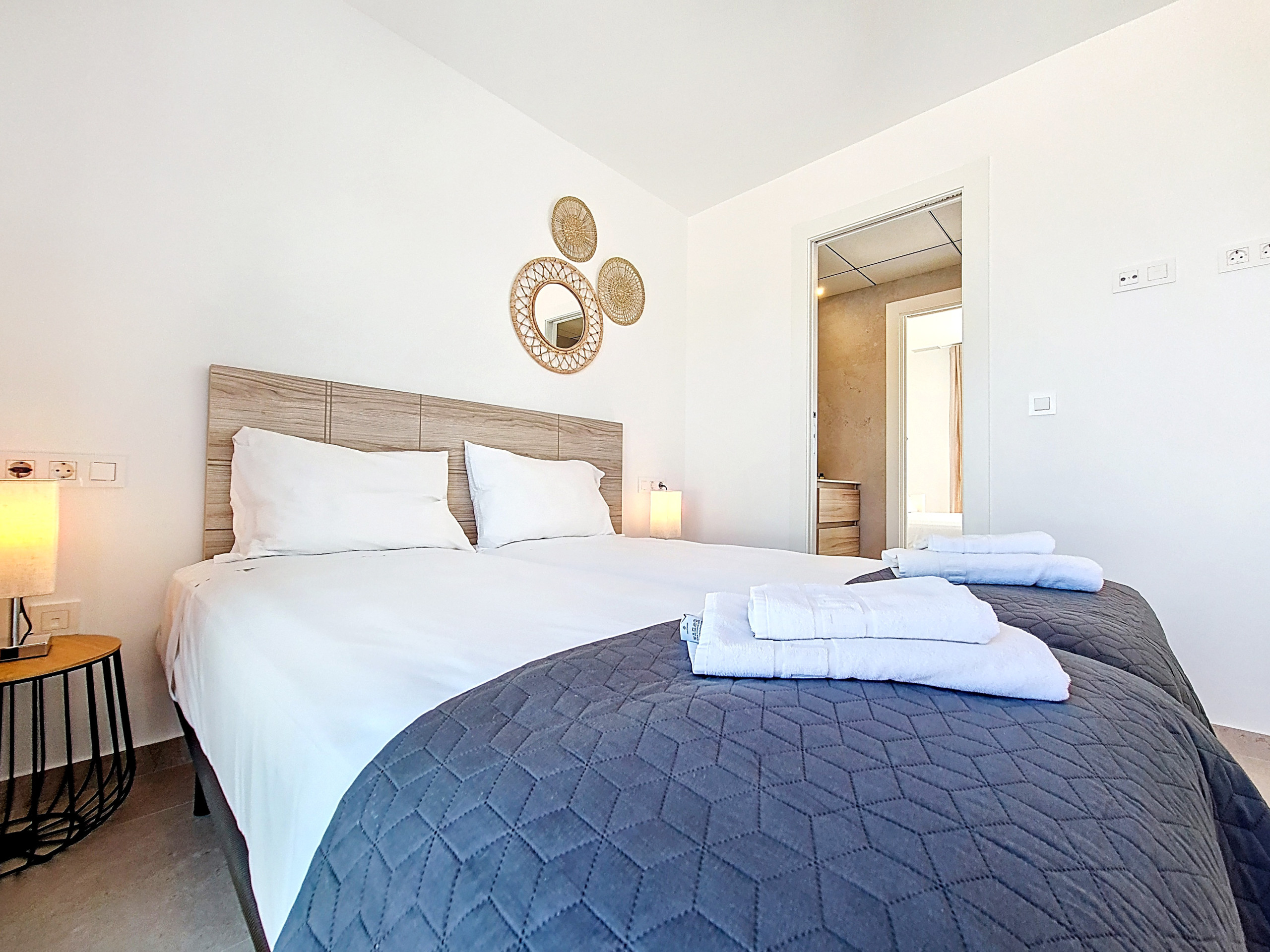 The 3rd bedroom has twin beds and is very similar to the first, modern with plenty of wardrobe space. Situated between the two bedrooms there is also another bathroom, with a walk in shower.