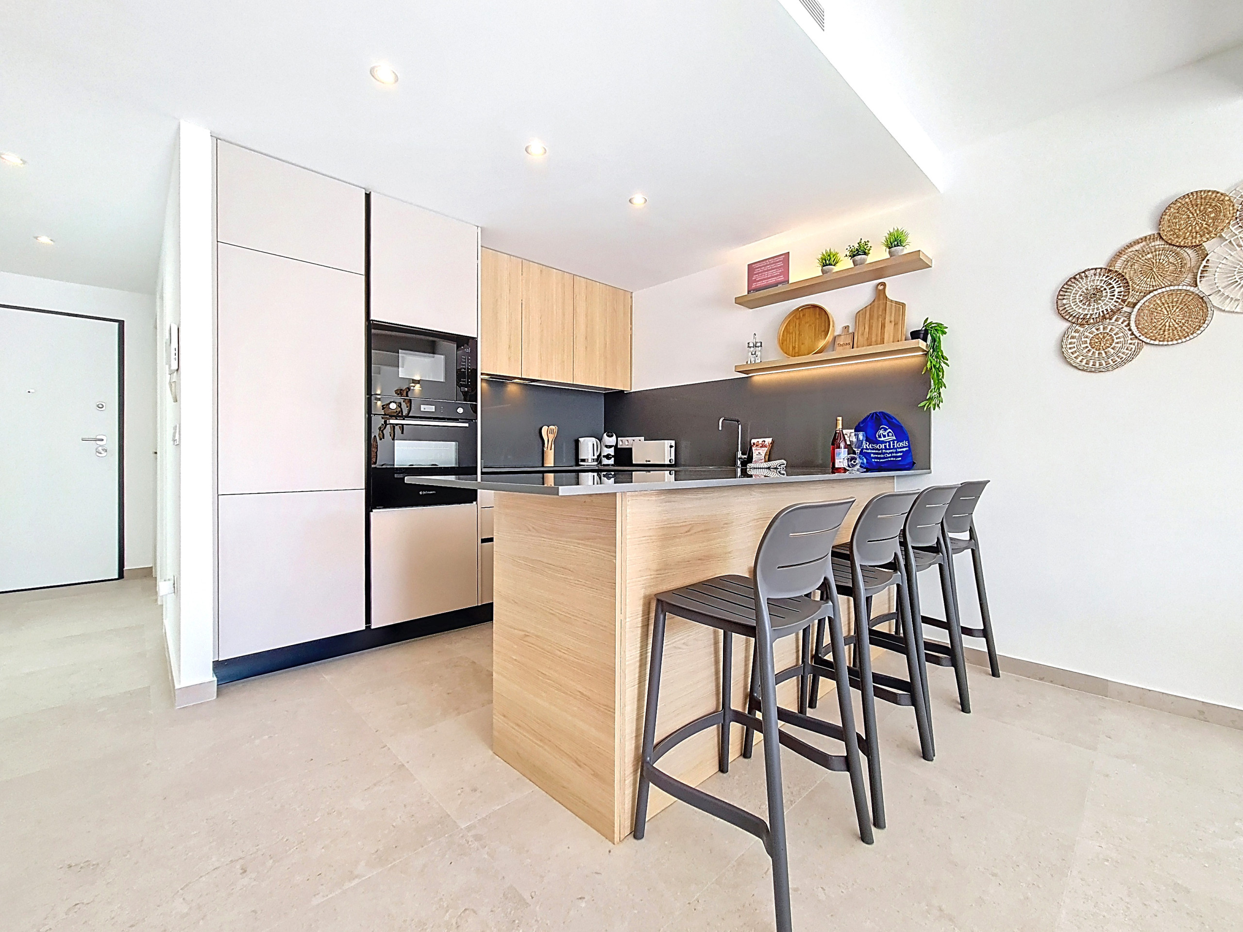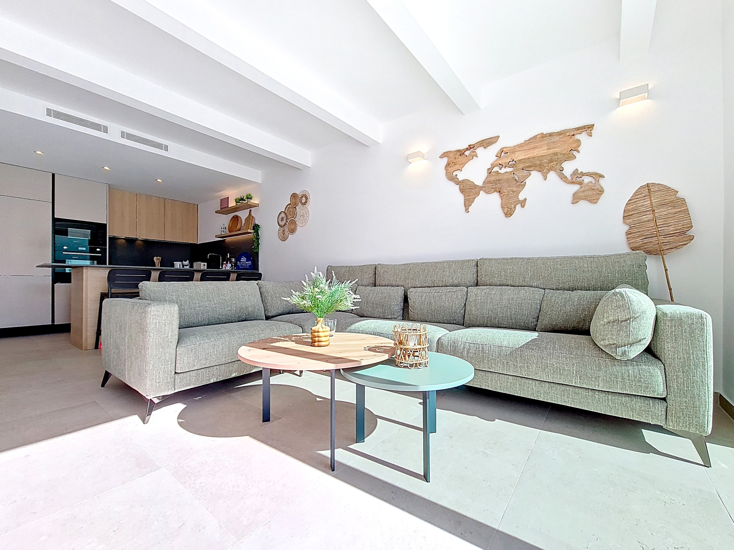 The bright open-plan living area is filled with natural light and thoughtfully designed for easy living. The fully equipped kitchen features sleek finishes and a breakfast bar, complemented by a spacious lounge area with a large Smart TV. Throughout the villa, natural wood tones and soft, warm accents create a cosy yet stylish atmosphere. A separate utility area with a washing machine provides extra convenience. Large patio doors open directly onto the garden and pool, seamlessly connecting indoor and outdoor living.