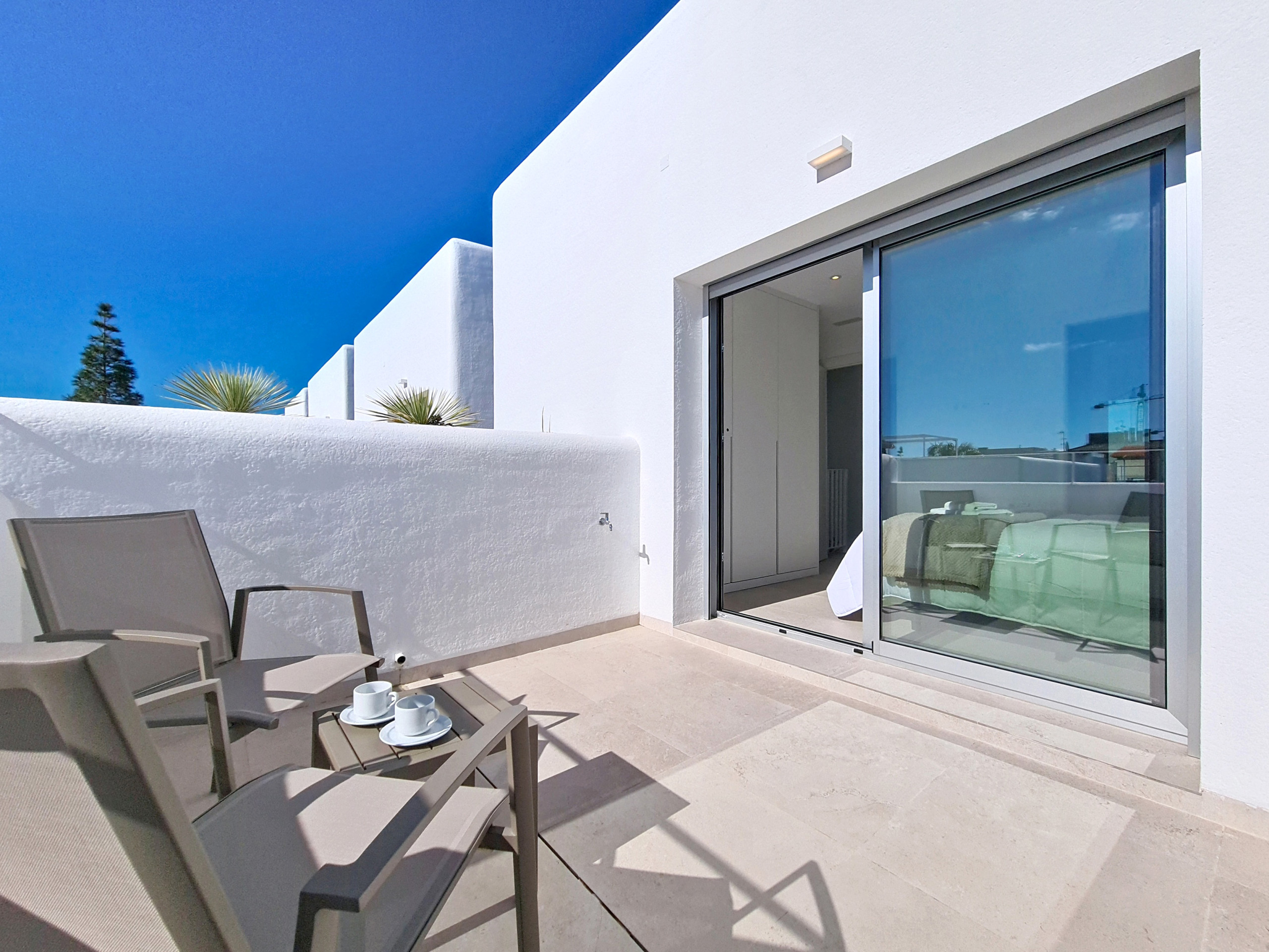 The main bedroom is located on the ground floor and sits alongside a contemporary bathroom with a walk-in shower, accessible from both the bedroom and the hallway, ideal for guests of all ages. Upstairs, two further bedrooms share a stylish central bathroom with a walk-in shower, accessed via separate sliding doors from each bedroom. Both upstairs bedrooms also benefit from their own private balcony, each furnished with a small table and chairs, perfect for a morning coffee or a quiet moment outdoors.