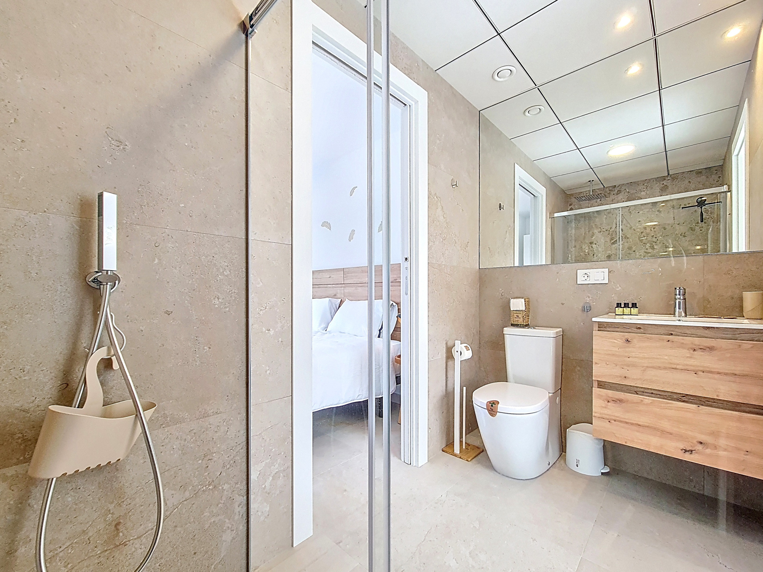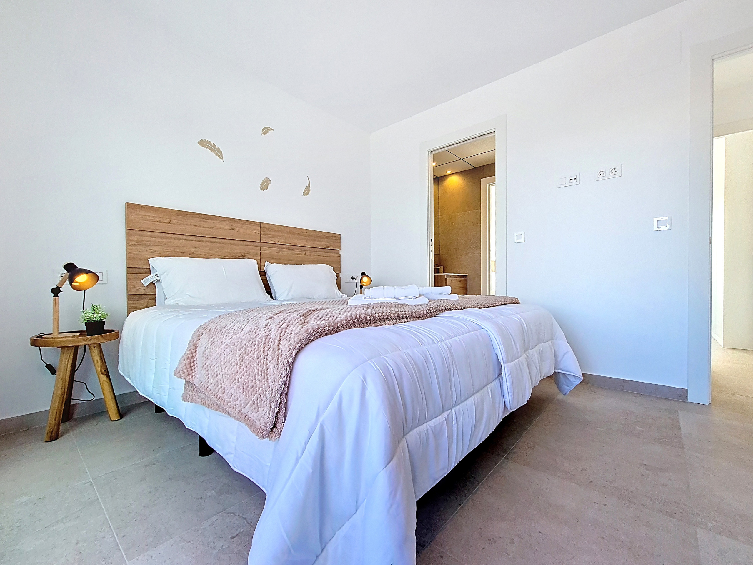 The main bedroom is located on the ground floor and sits next to a modern bathroom with a walk-in shower and access from the hallway, making it ideal for guests of all ages. Upstairs, you’ll find two further bedrooms, each with access to a shared central bathroom featuring another walk-in shower and designed with sliding doors that open from both bedrooms. Both upstairs bedrooms also feature their own private balcony, each furnished with a small coffee table and chairs. The bedrooms are tastefully decorated with warm accents, creating a cosy and relaxing feel.