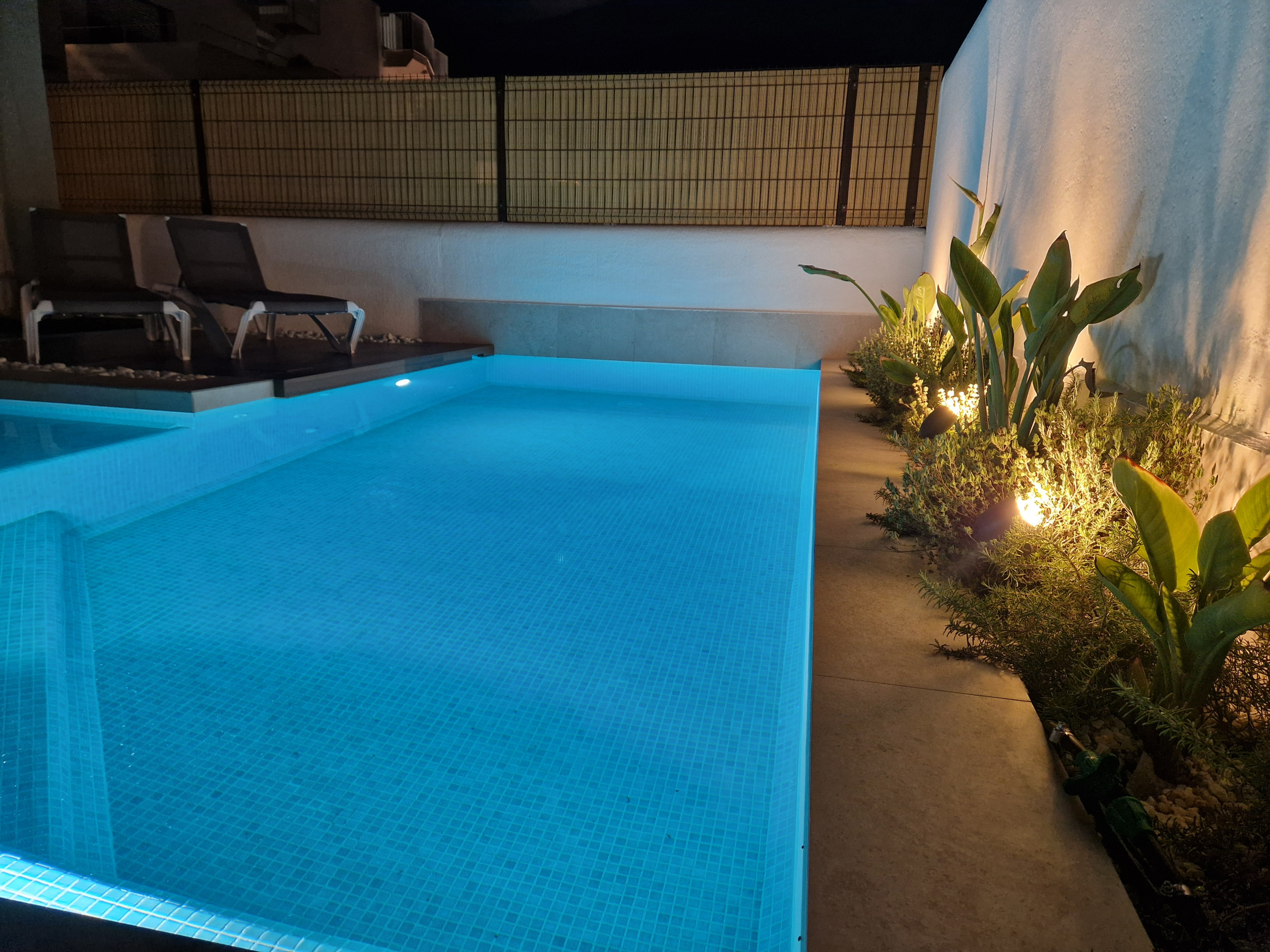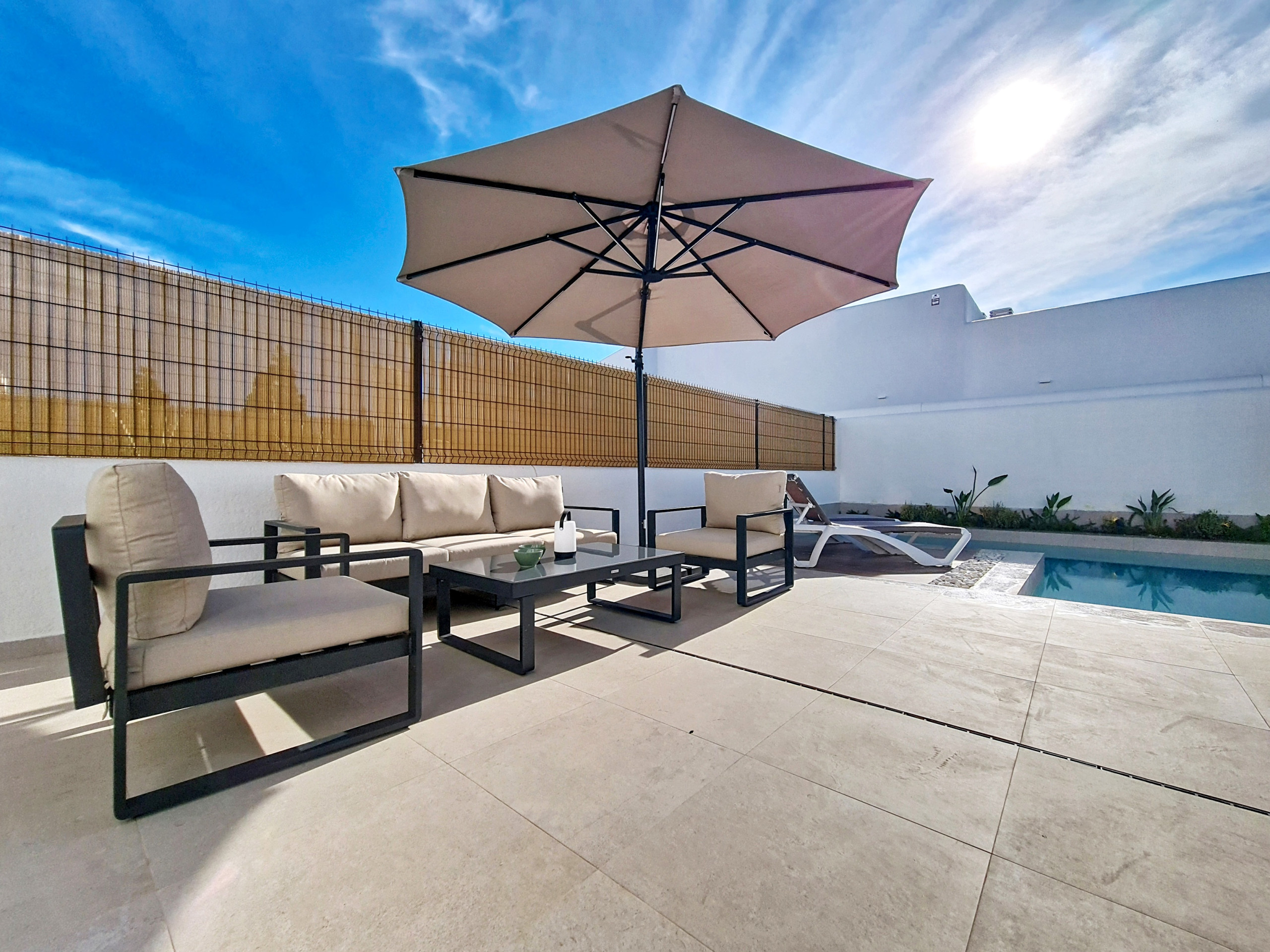 • Privézwembad in L-vorm met ligbedden en parasol