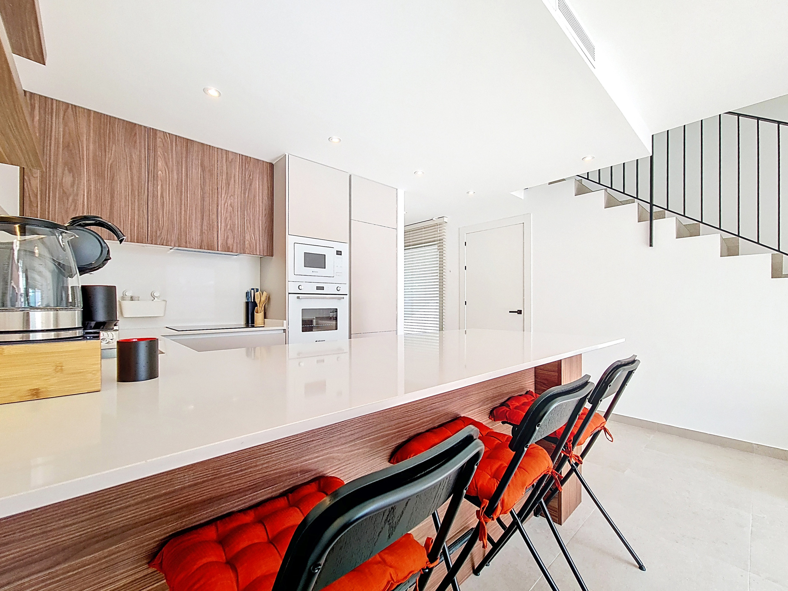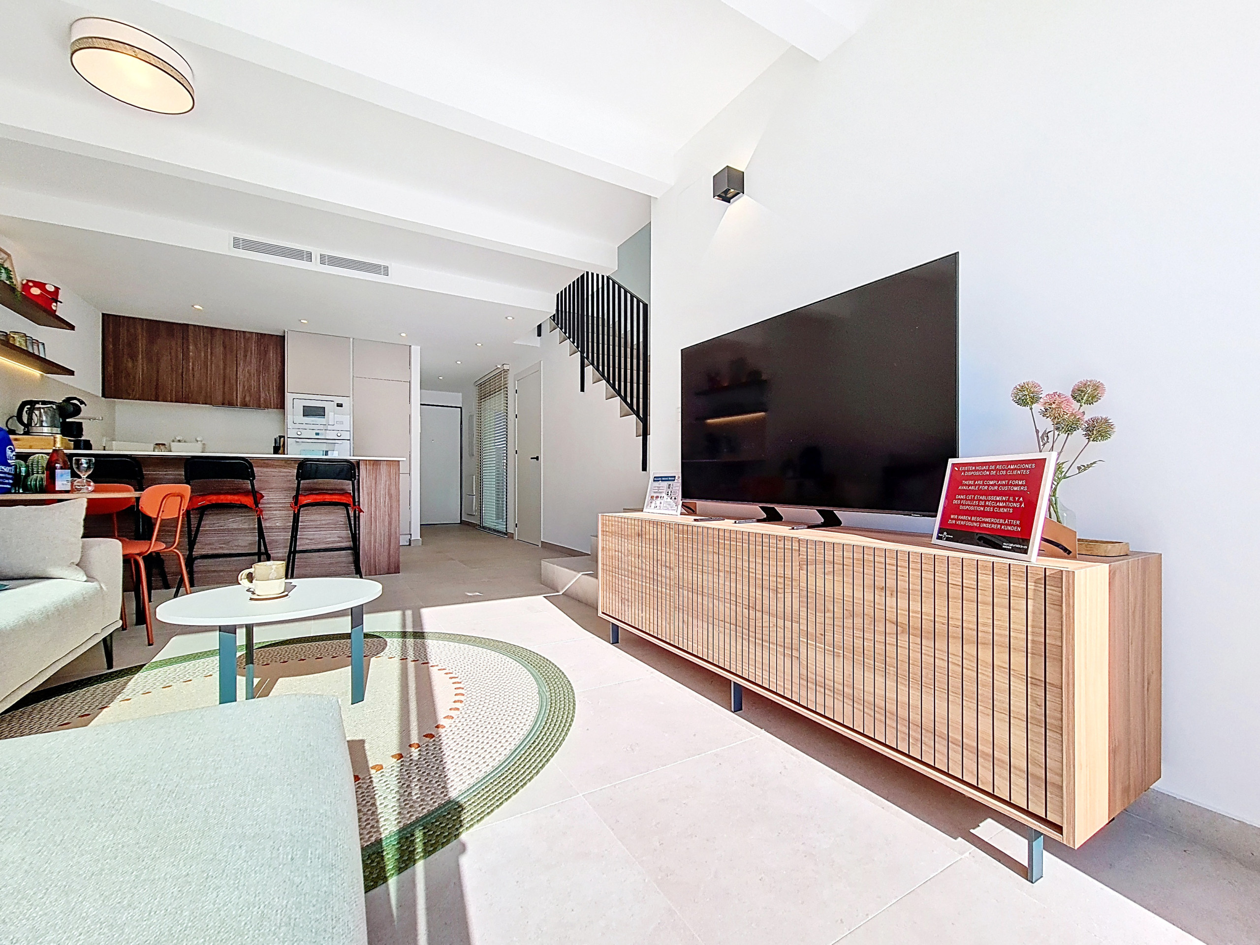 De begane grond beschikt over een lichte open-planindeling, met een stijlvolle, volledig uitgeruste keuken die overloopt in de eet- en woonruimte. Een bergruimte onder de trap herbergt een wasmachine, terwijl de gezellige woonkamer met comfortabele zitplaatsen en een Smart TV perfect is om te ontspannen na een dag in de zon.