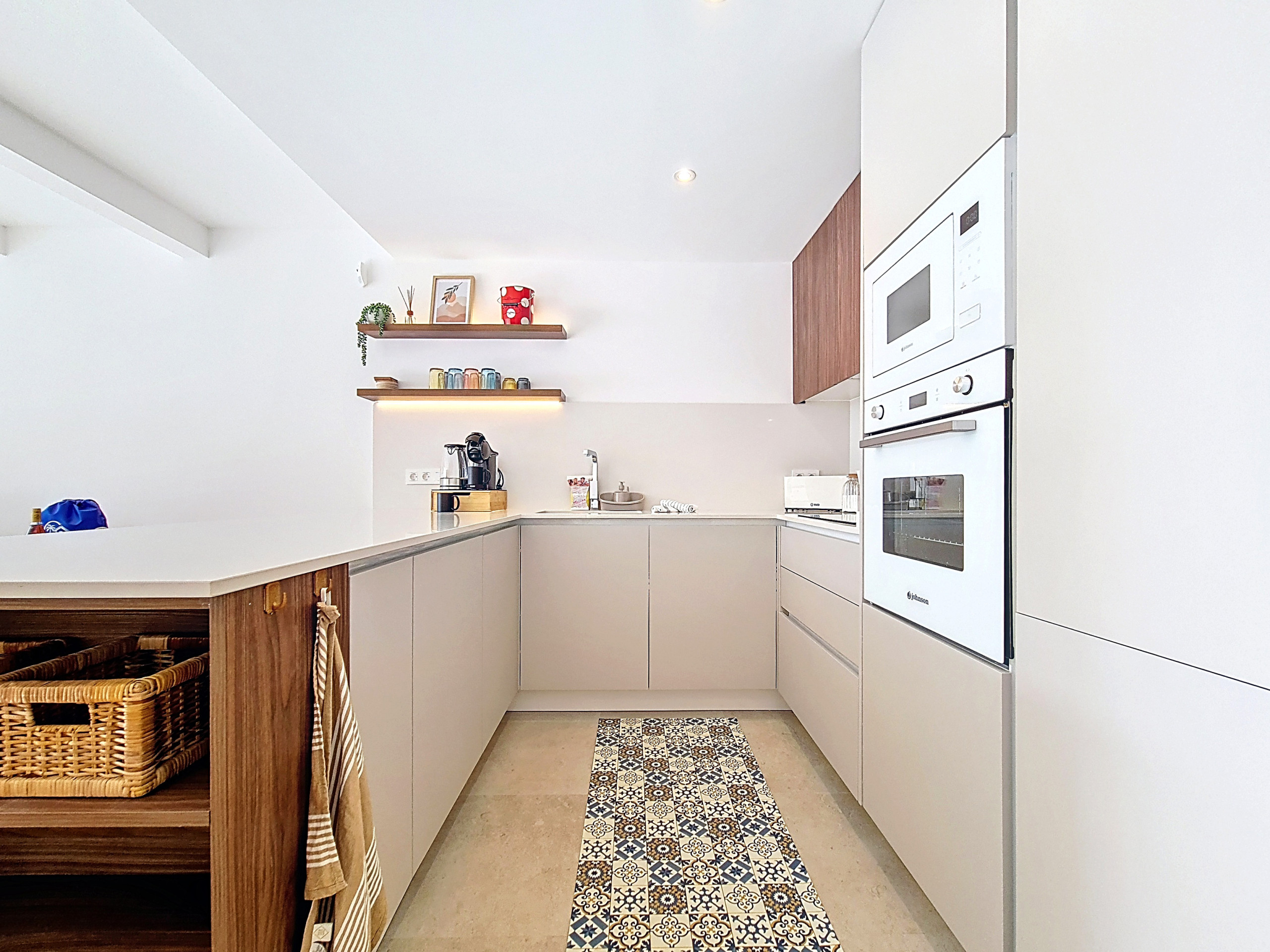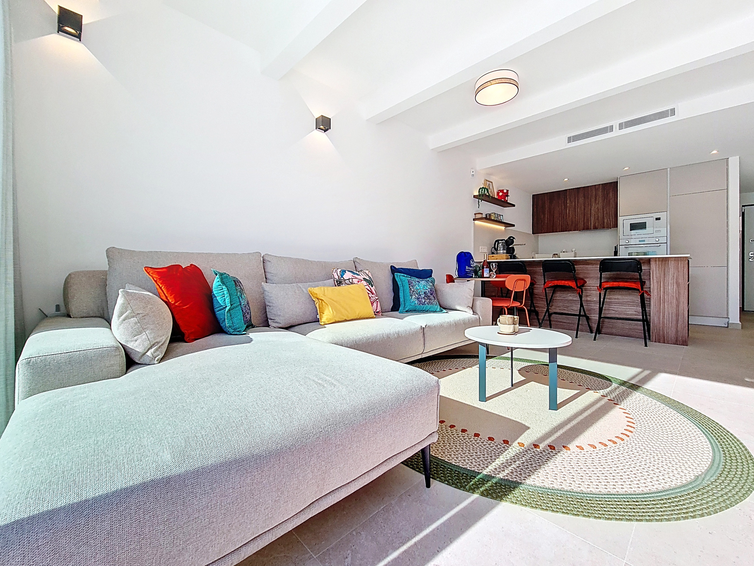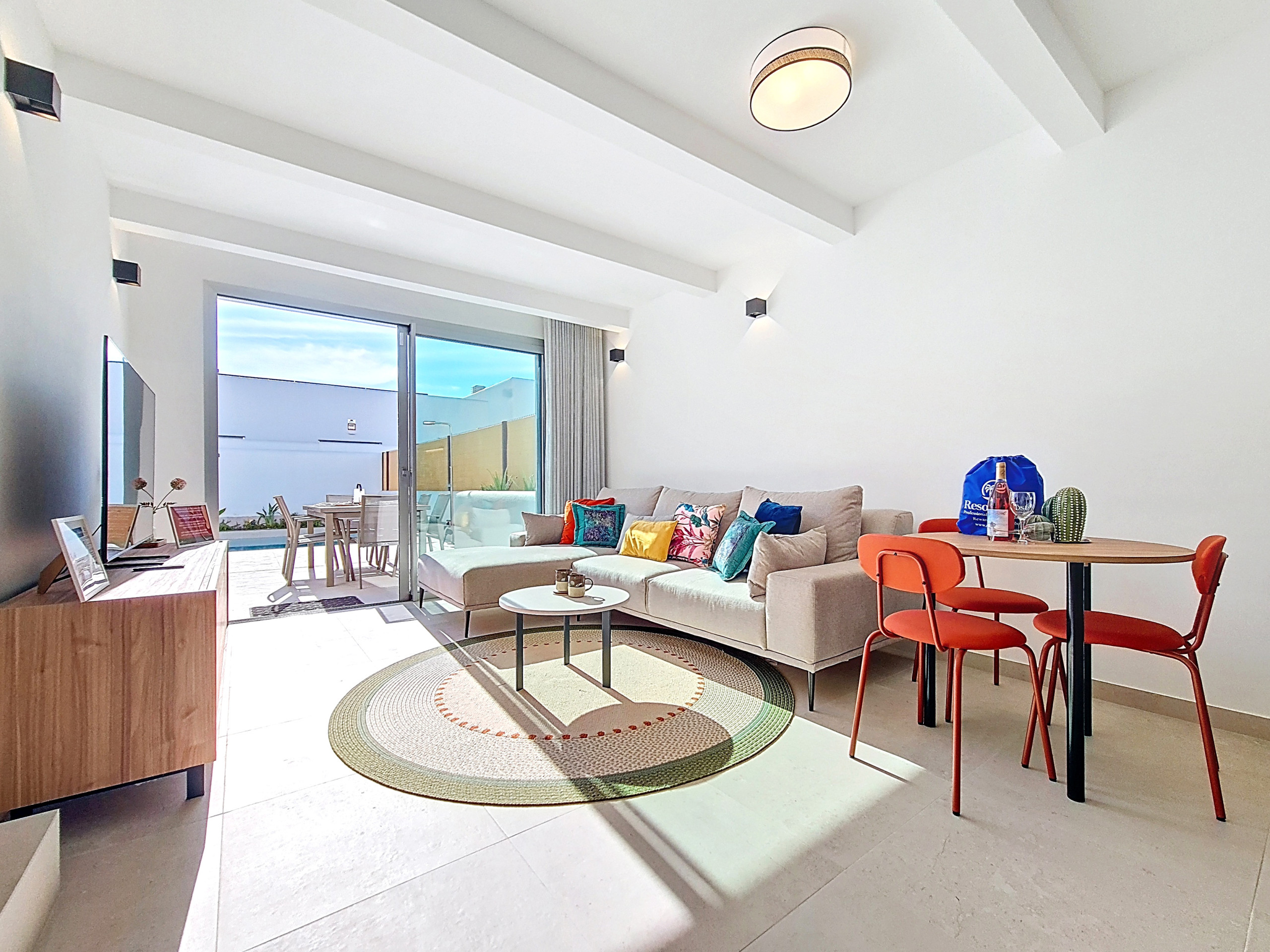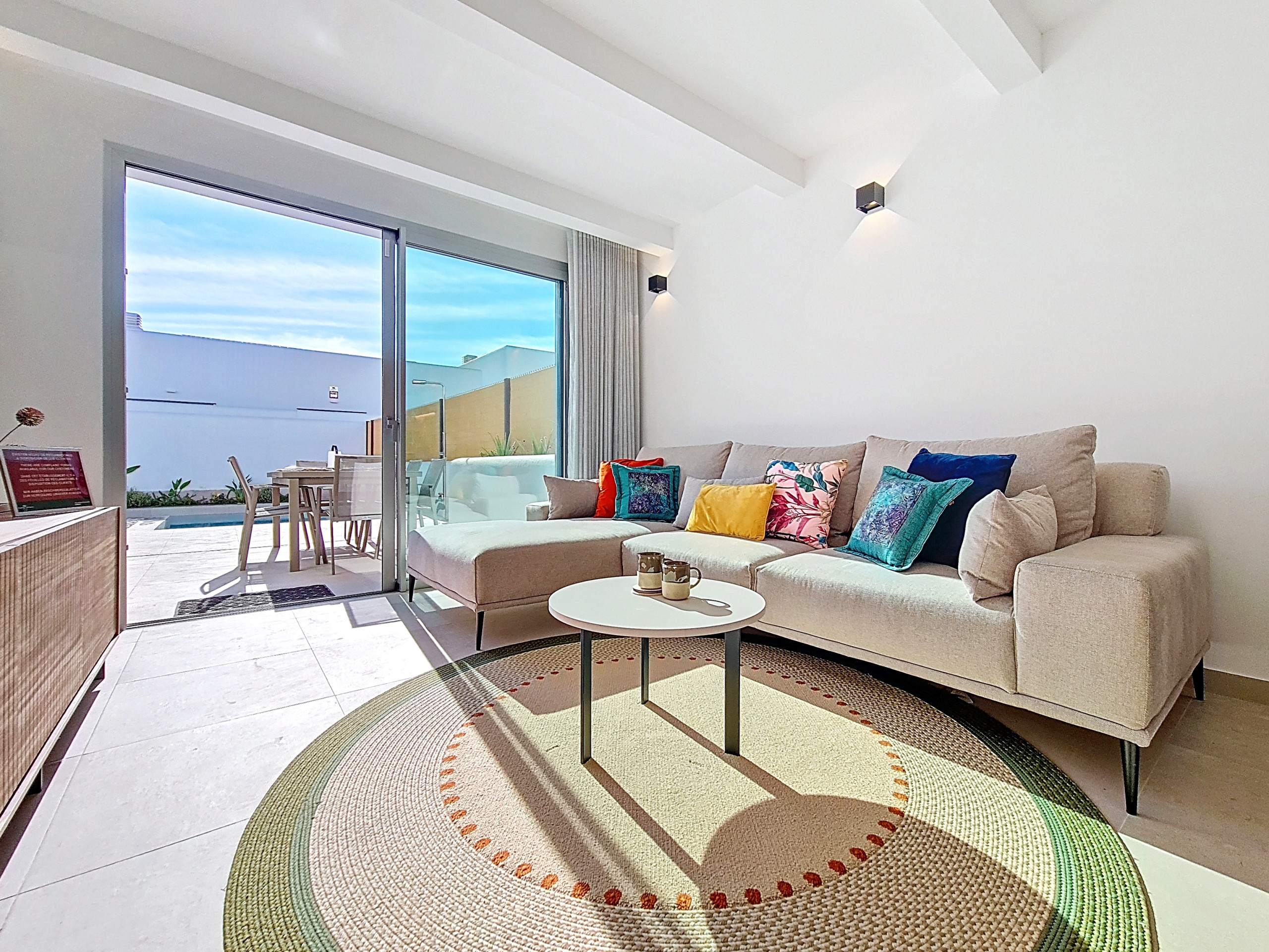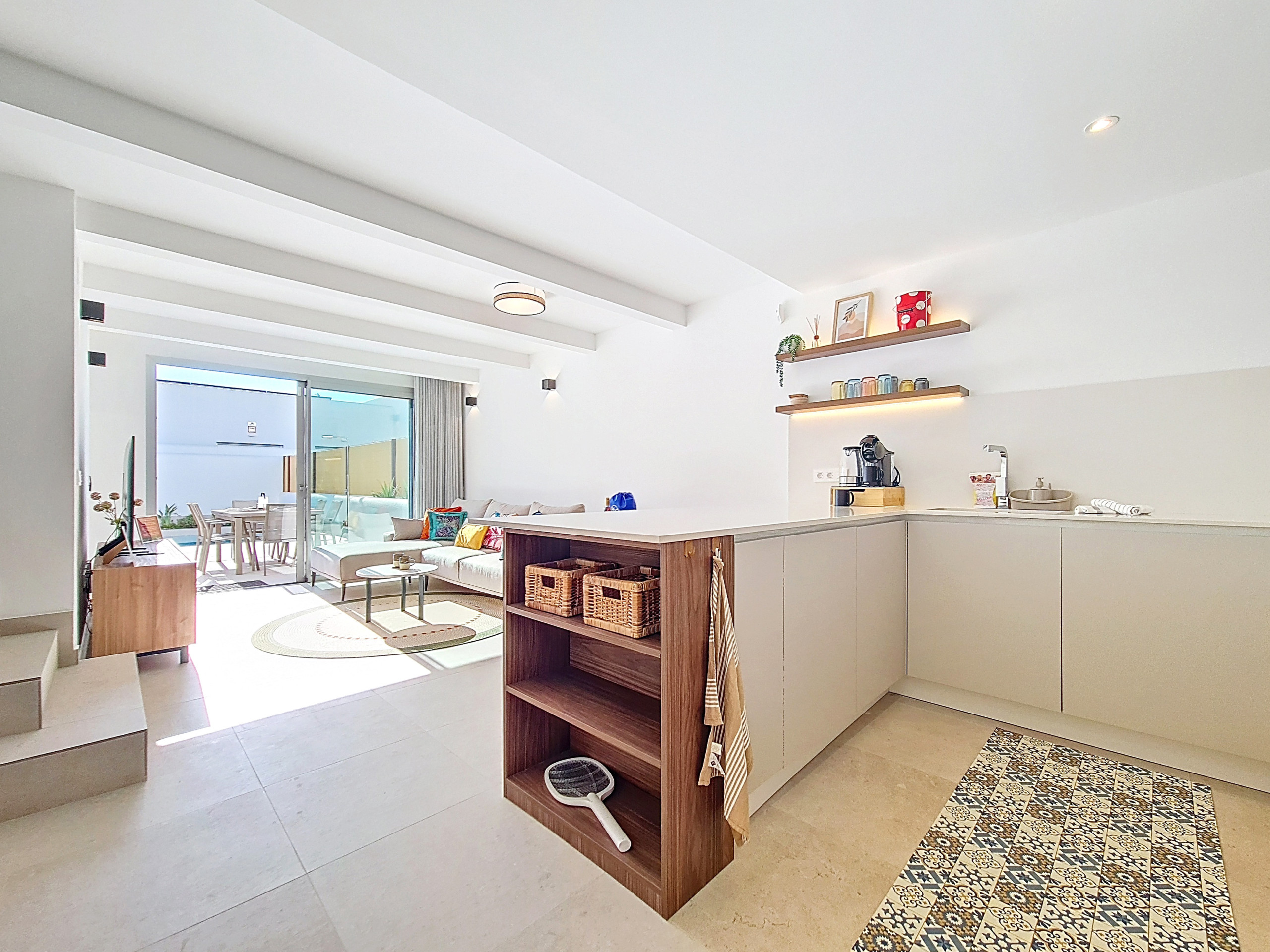 De open-plan woonruimte is licht en uitnodigend, met een volledig uitgeruste keuken met een ontbijtbar, een kleine eettafel en een ruime woonkamer met een grote Smart TV. Zachte accenten van warme kleuren door de hele decoratie creëren een gezellige, uitnodigende sfeer. Een aparte bergruimte bevat een wasmachine voor extra gemak. Grote patio-deuren laten veel natuurlijk licht binnen en openen direct naar de privétuin en het zwembadgedeelte.