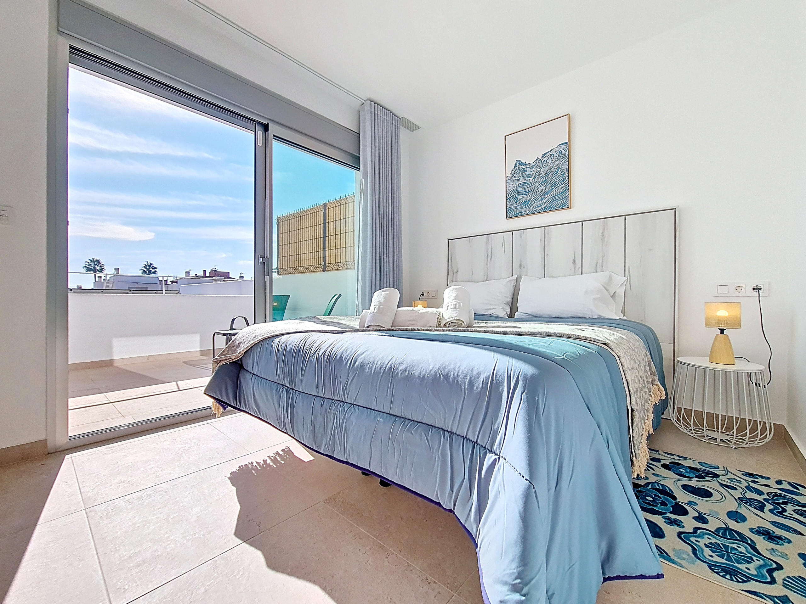 De hoofdslaapkamer bevindt zich op de begane grond en grenst aan een moderne badkamer met een inloopdouche en toegang vanuit de hal, waardoor deze ideaal is voor gasten van alle leeftijden. Boven vindt u twee verdere slaapkamers, elk met toegang tot een gedeelde centrale badkamer met nog een inloopdouche en ontworpen met schuifdeuren die openen vanuit beide slaapkamers. Beide slaapkamers boven hebben ook een eigen privébalkon, elk ingericht met een kleine salontafel en stoelen. De slaapkamers zijn smaakvol gedecoreerd met warme accenten, waardoor een gezellige en ontspannen sfeer wordt gecreëerd.