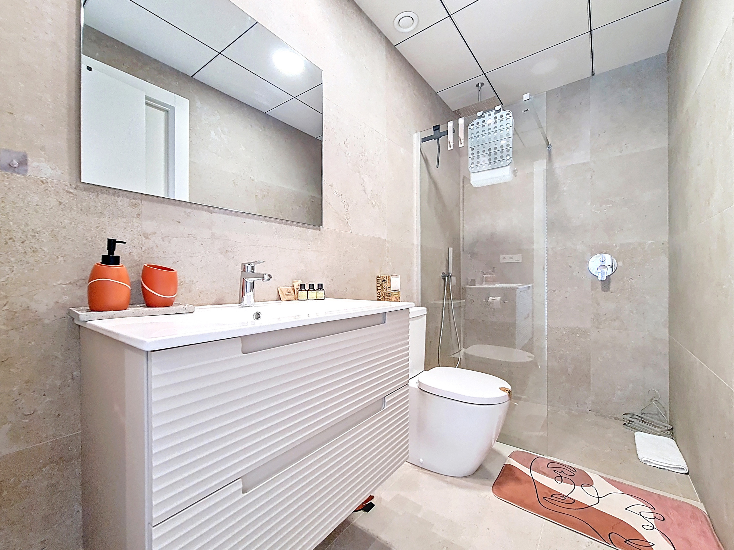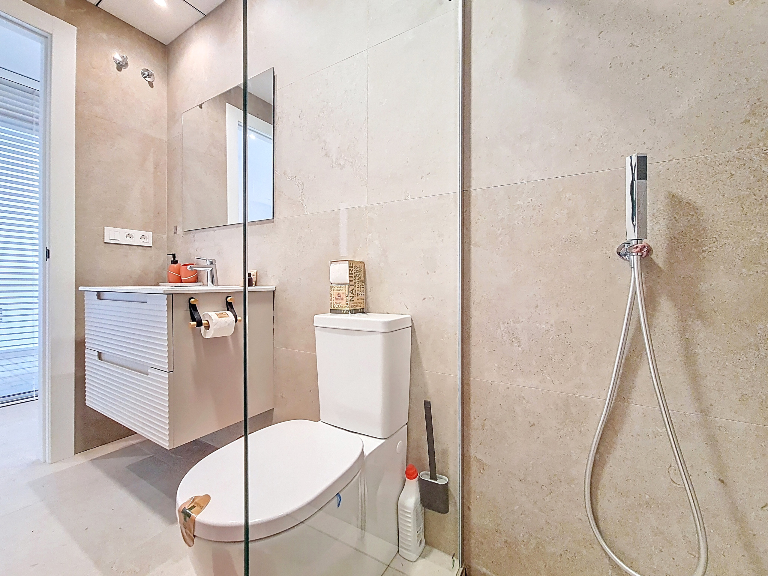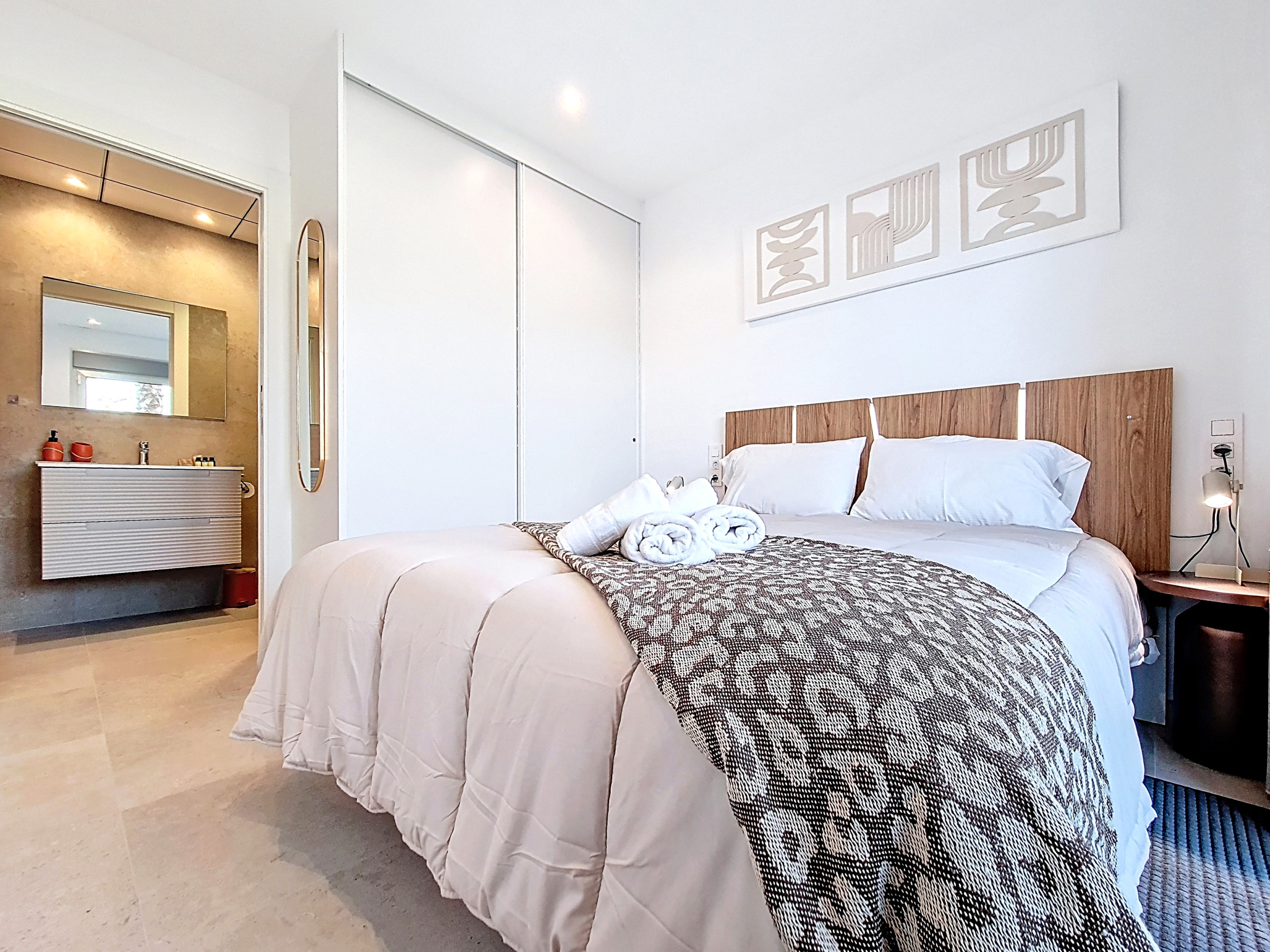• Slaapkamer 1 (Begane grond): Aangrenzende badkamer (dubbele toegang vanuit slaapkamer & gang), gezellige decoratie met warme houtintonaties